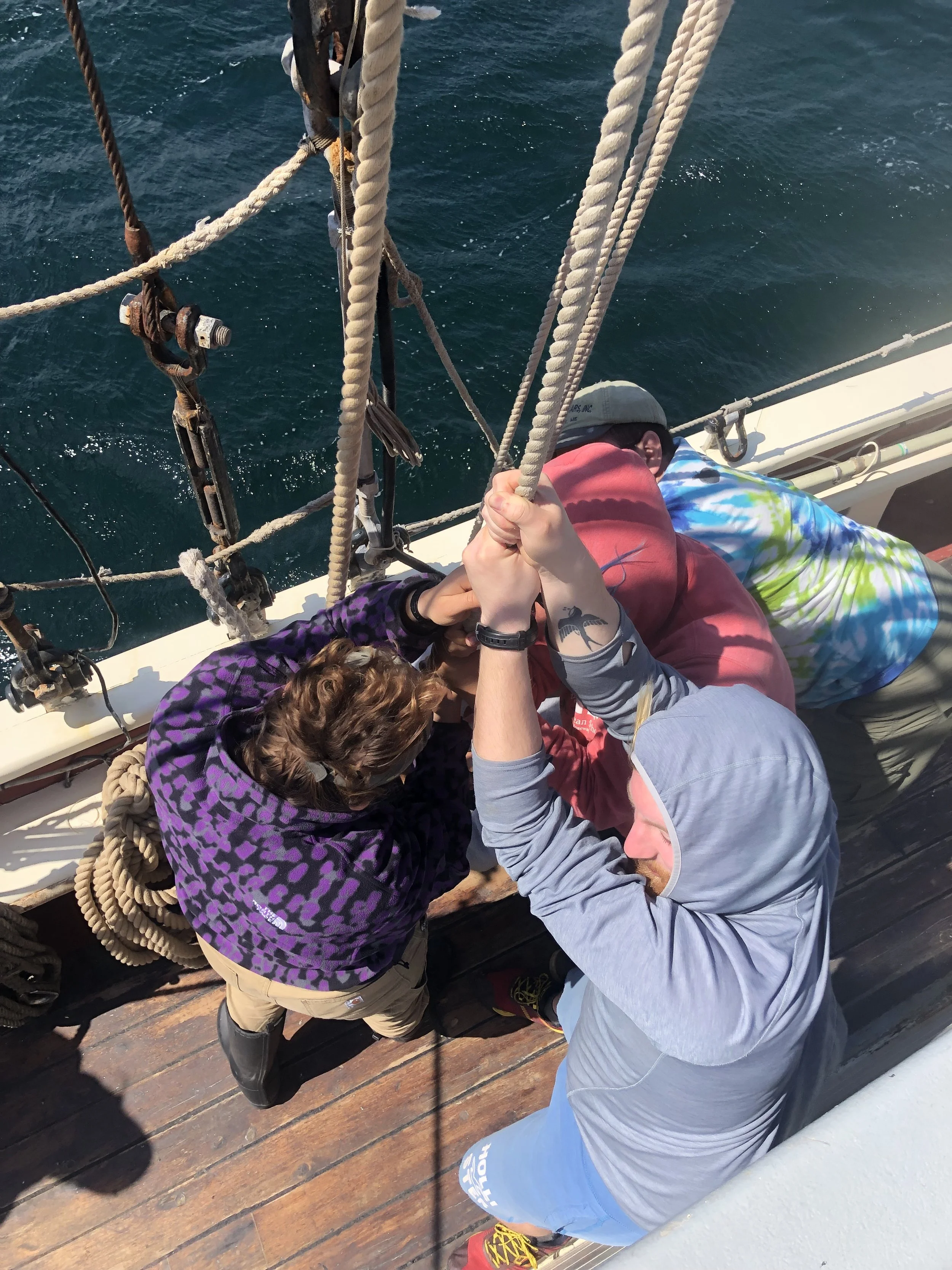 Around 1 in the morning I took seasick medication and went to bed in my bunk. I was woken up around 7 am. During chores I helped scrub the sole and for breakfast there was sausage, biscuits and gravy. After breakfast I washed dishes like we do after every meal. We set the sails and afterwards I coiled the lines. At lunch we had chicken noodle soup, homemade bread, and salad. We stopped lunch dishes midway through so we could prepare to sail onto the hook. That was pretty amazing. For sailing onto the hook, everything has to be timed perfectly. I noticed some sweatshirts that were sliding off the deck towards the ocean when we were heeled over, so I grabbed them and stuffed them between some deck boxes so that they wouldn’t fly away.