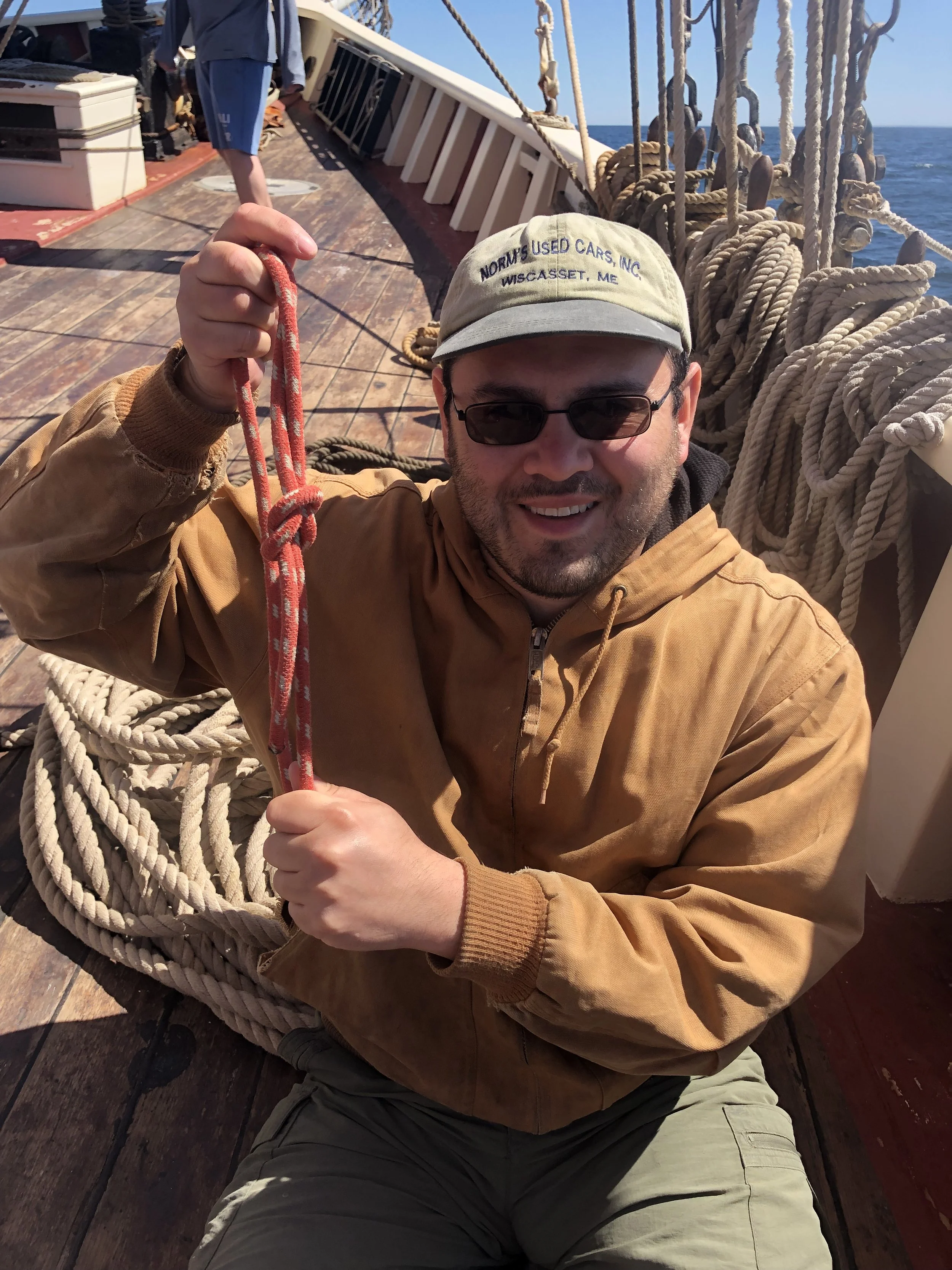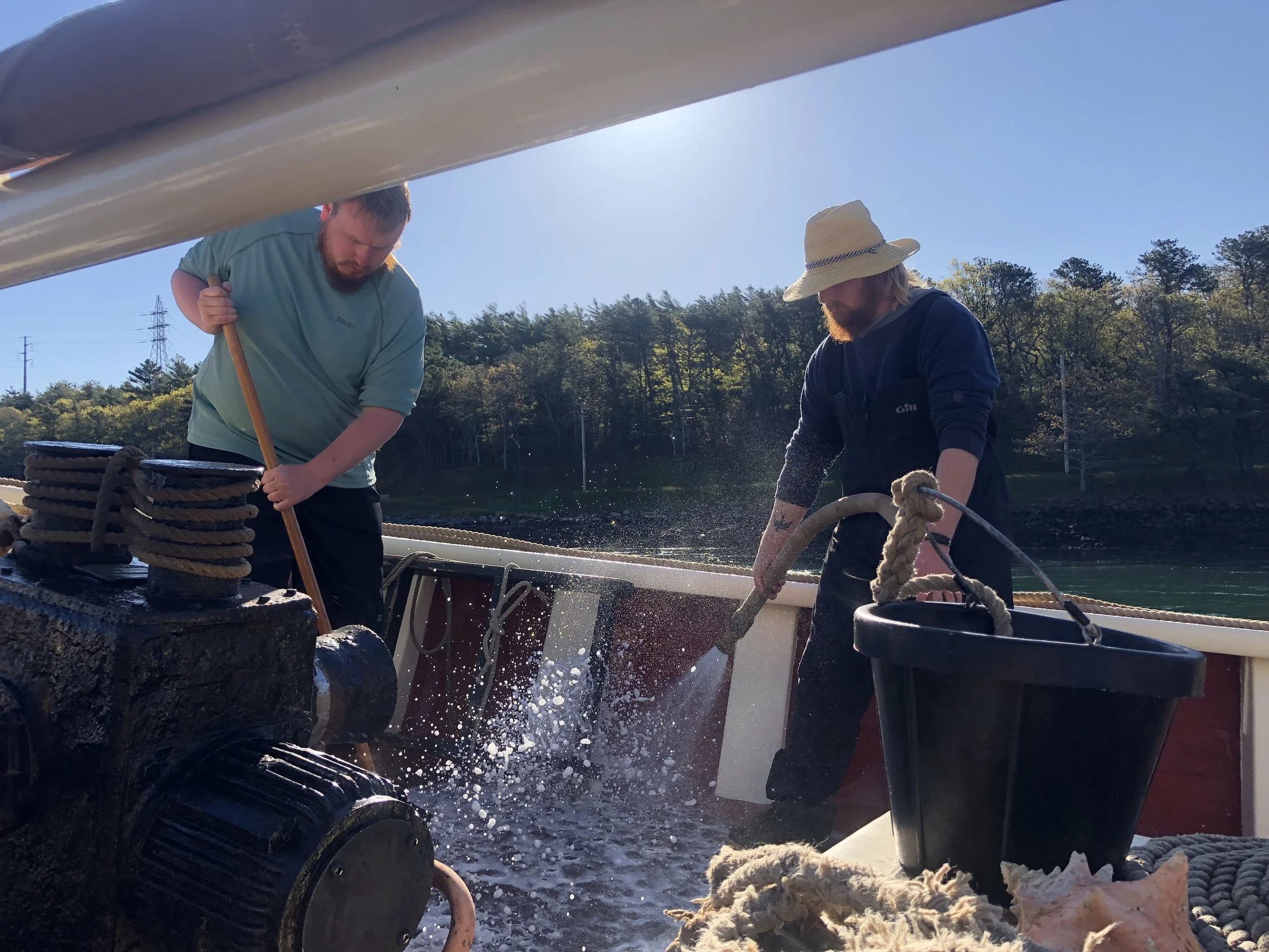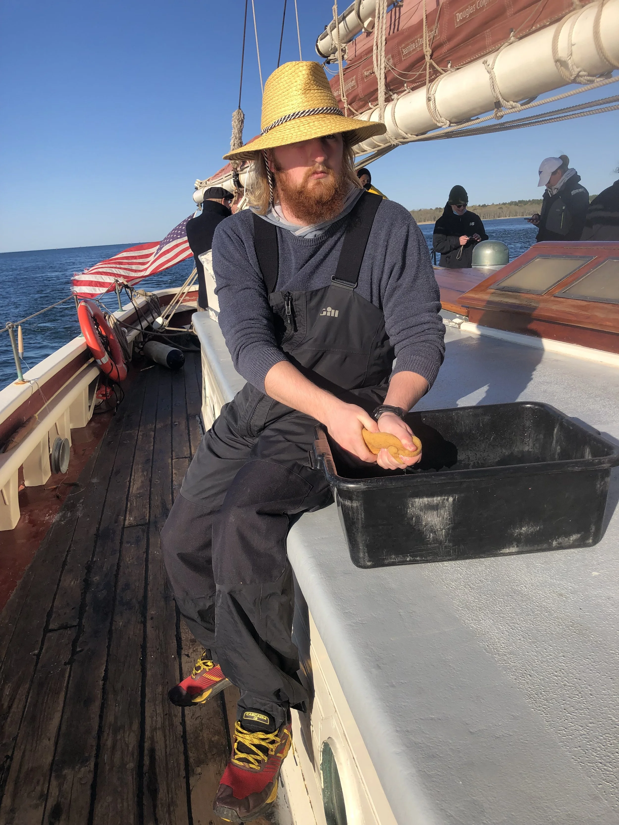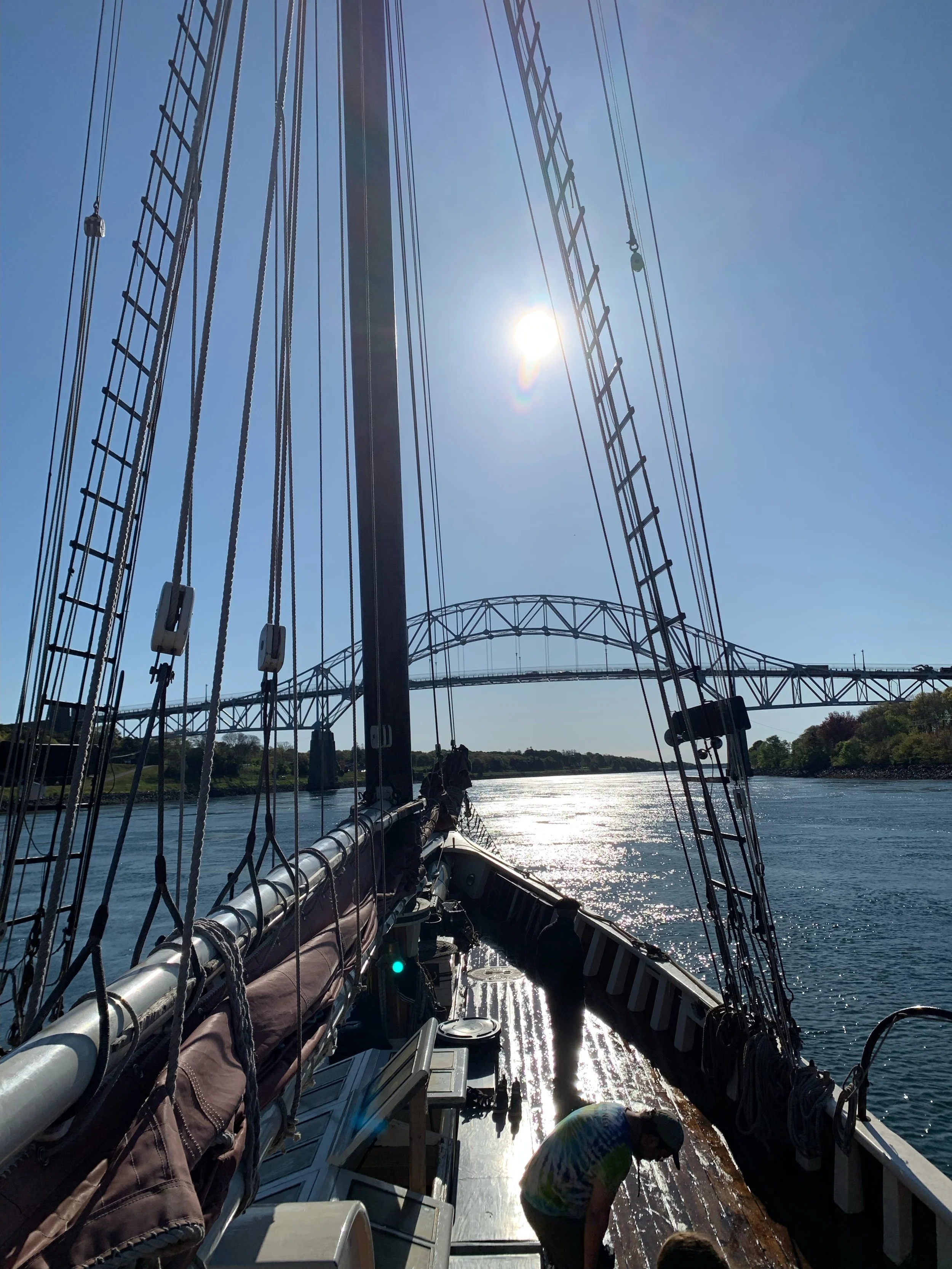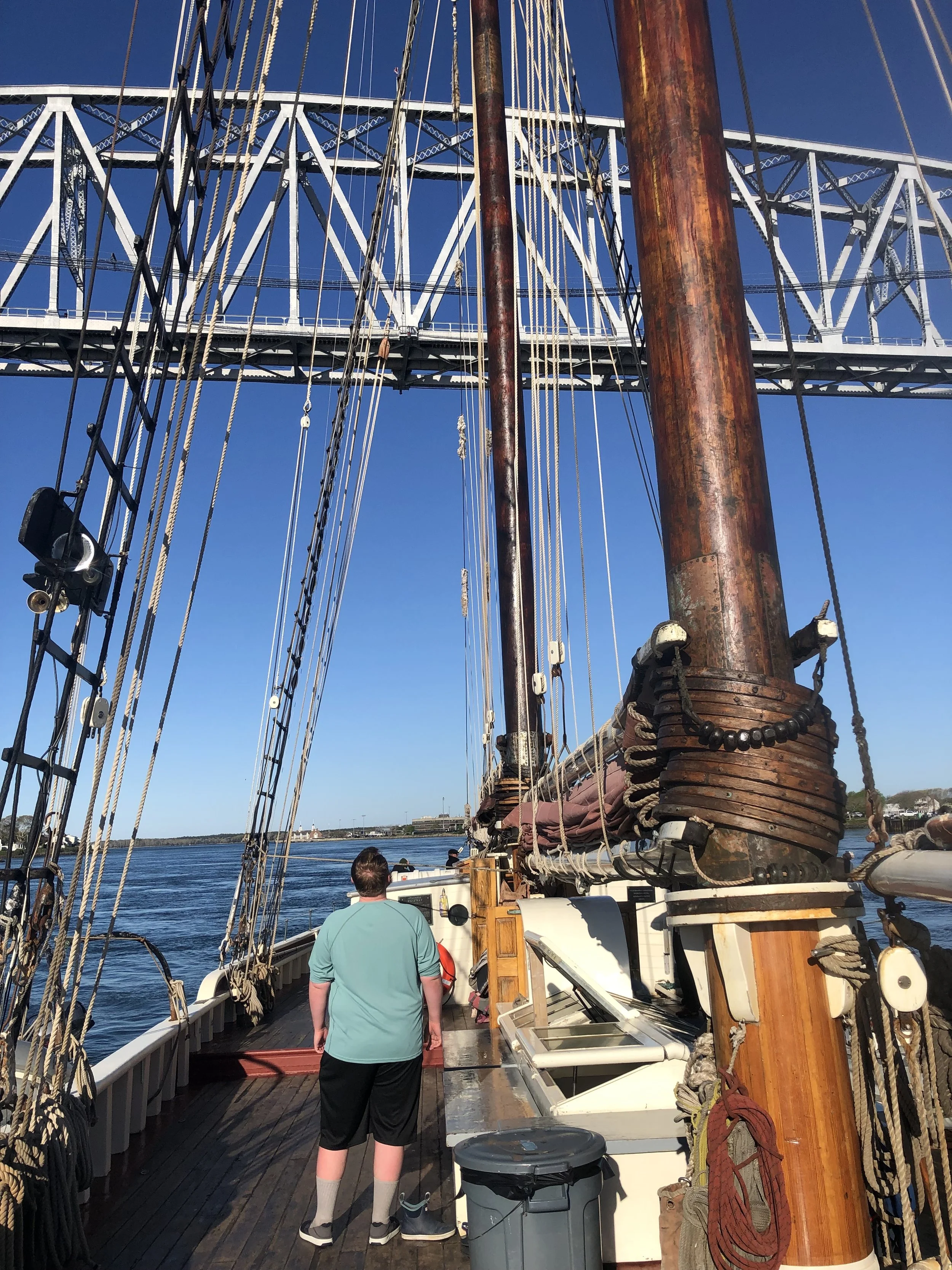 Once we dropped anchor, we took in sail and I helped daisy chain the jumbo furl. I did a lot of hauling on lines and also helped to flake the main sail as it came down. After setting the anchor we finished cleaning dishes from lunch. When I was on active watch, I spent some time at the bow on forward lookout. I was multitasking at the bow, looking for boats, putting on sunscreen, and trying to get the knots out of my hair. We anchored near Provincetown and took a small boat in. It was not smooth, but I had on foulie pants and jacket, but we still got very wet. The boat got so full of water we had to pump it out as we drove in.