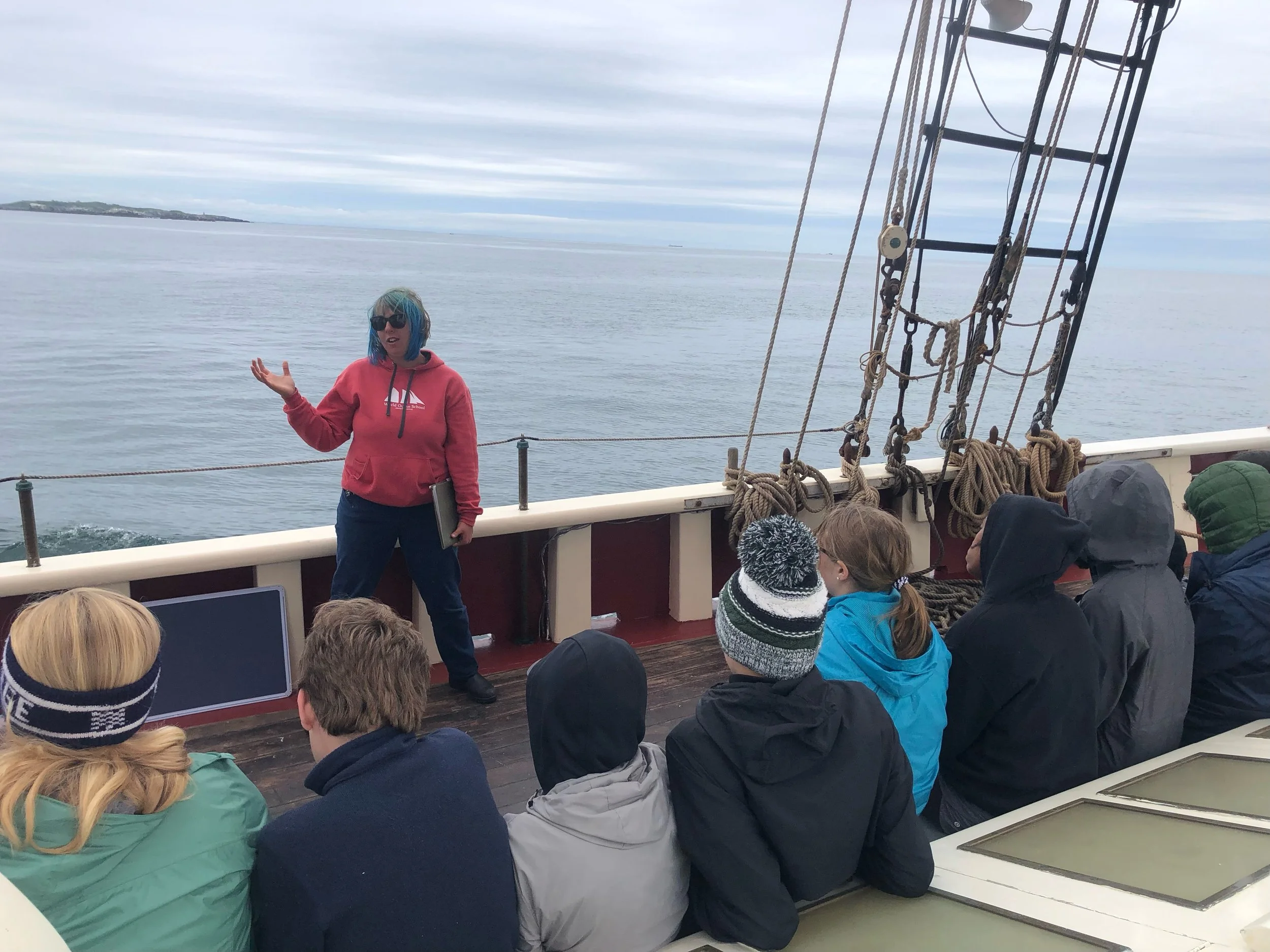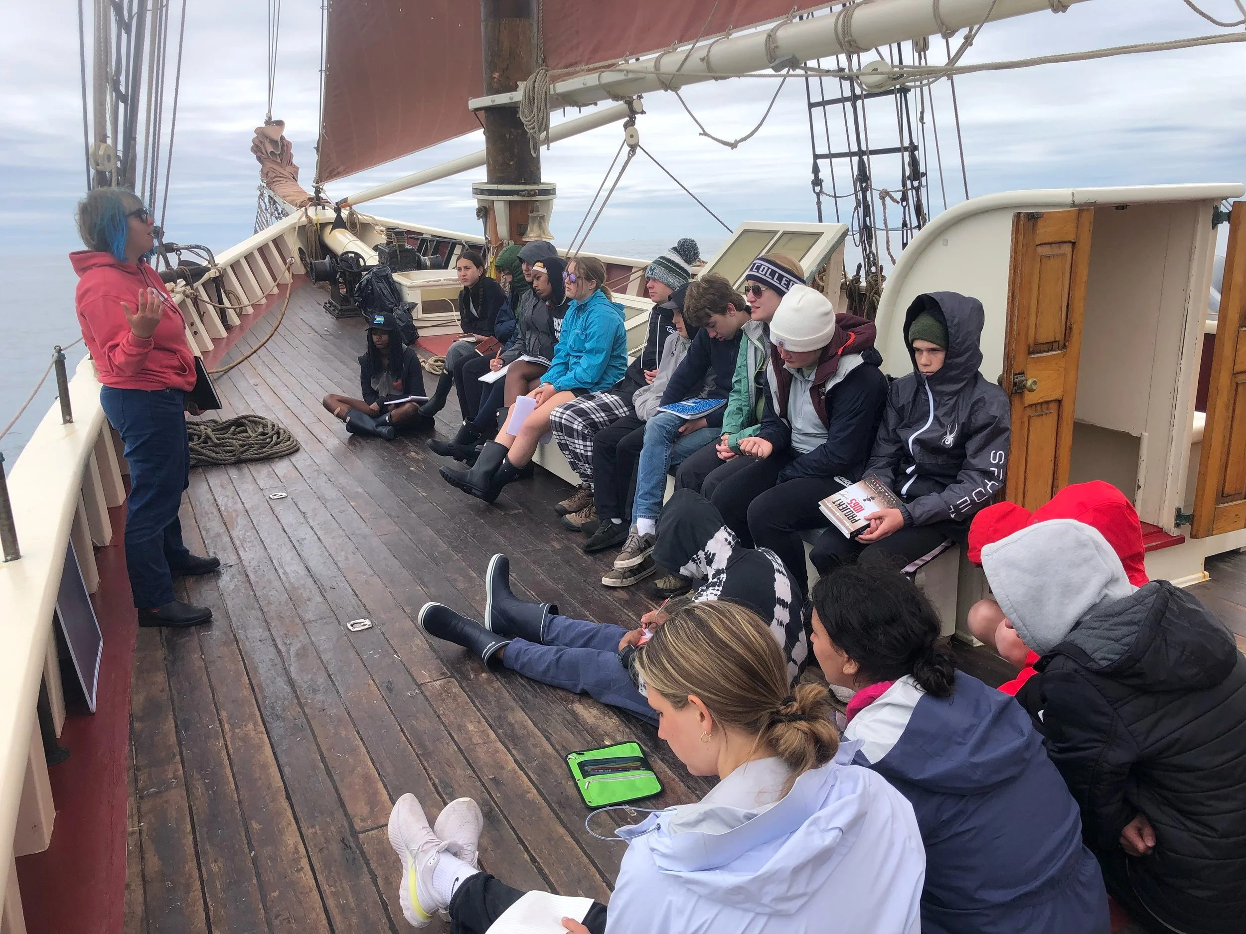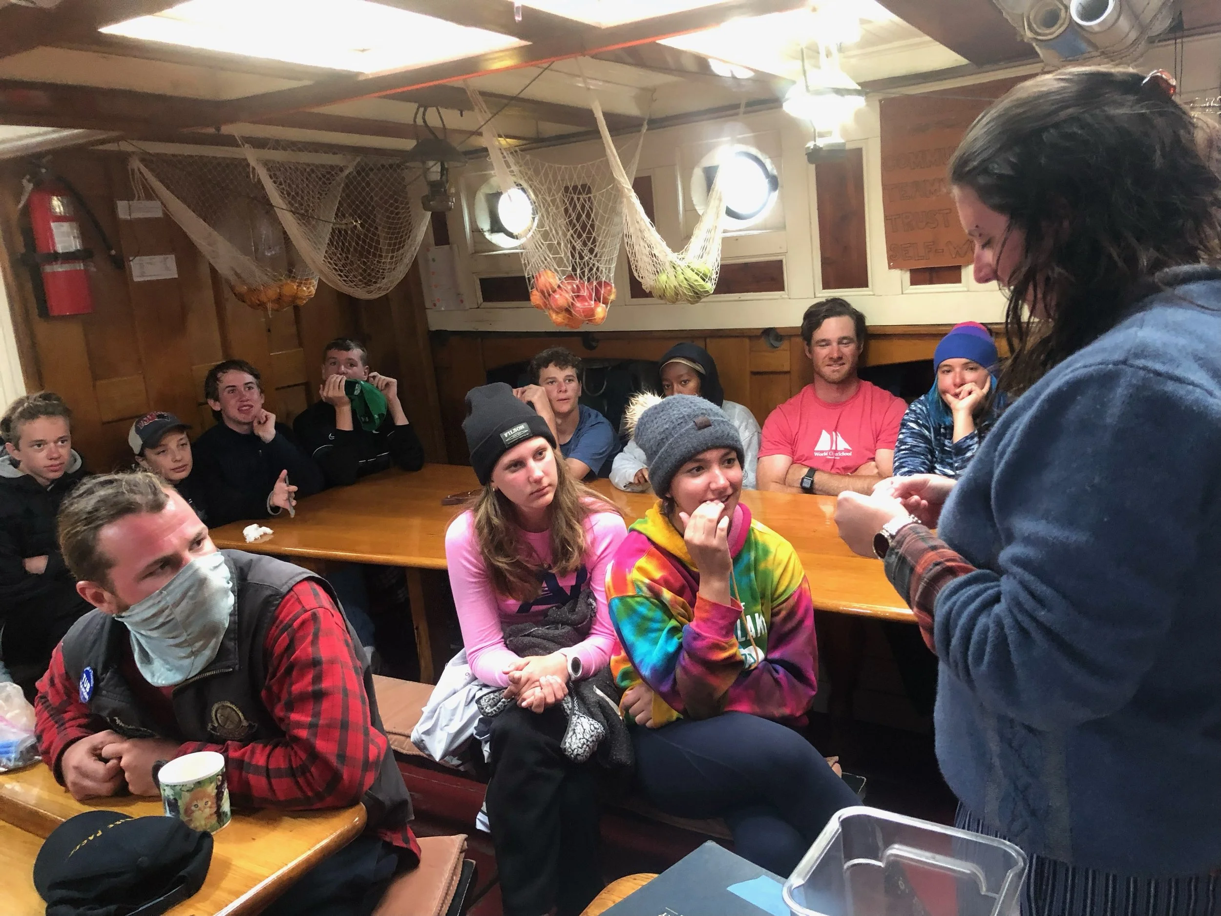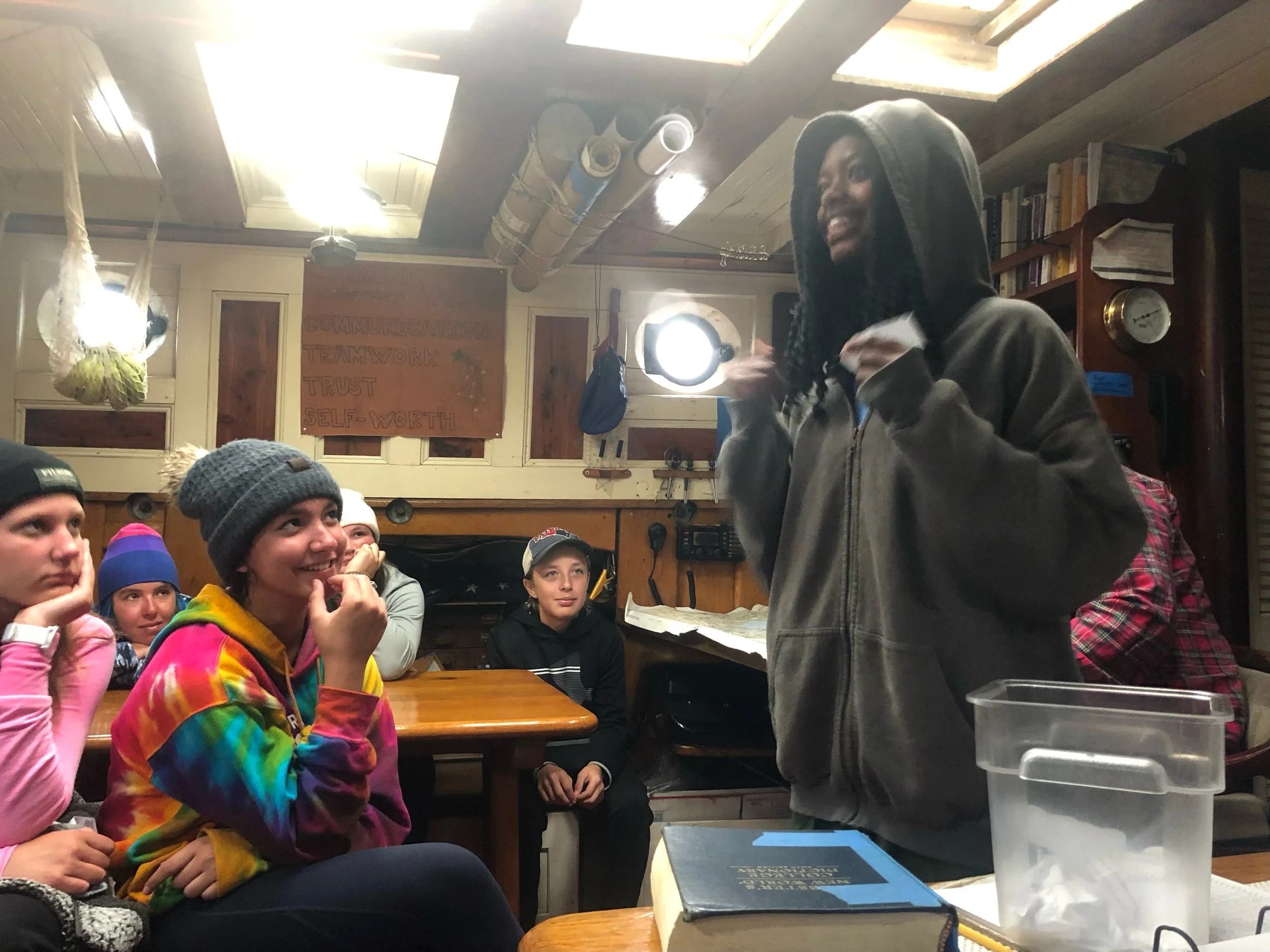 Last night the anchor watches went well, it was chilly and everyone was a little bit tired, but it was a successful watch. We were woken up to the sound of Maddy’s voice calling all hands up on the deck. We started our morning chores and ate a strong, filling breakfast of potatoes and sausage. Once finished, we cleaned up our breakfast and prepared for the day. We grouped together and started raising the sails. We pulled up the anchor and sailed off the hook. Once off the anchor we first started our watches rotating through active watch, seamanship, and R&R. Shortly after we were on the bowsprit, we raised the jib which is the front sail. Then we did a lesson on sharks with Aurora. After our lesson we went back to our watches. We did that until it was time to drop anchor. We sailed into the hook using the wind and dropped anchor. After that we furled the jib and the jumbo and finished pulling down the main and fore sails. Then we dried off from the rain and we played charades in the main salon. After we finished our intense game of charades, we had around 1 hour of free time. Then it was time for dinner! Dinner was Mac and cheese which was very good. Then it was time to clean up and do chores. We ended the day by watching a movie and then it was free time for the various groups to do the anchor watches.