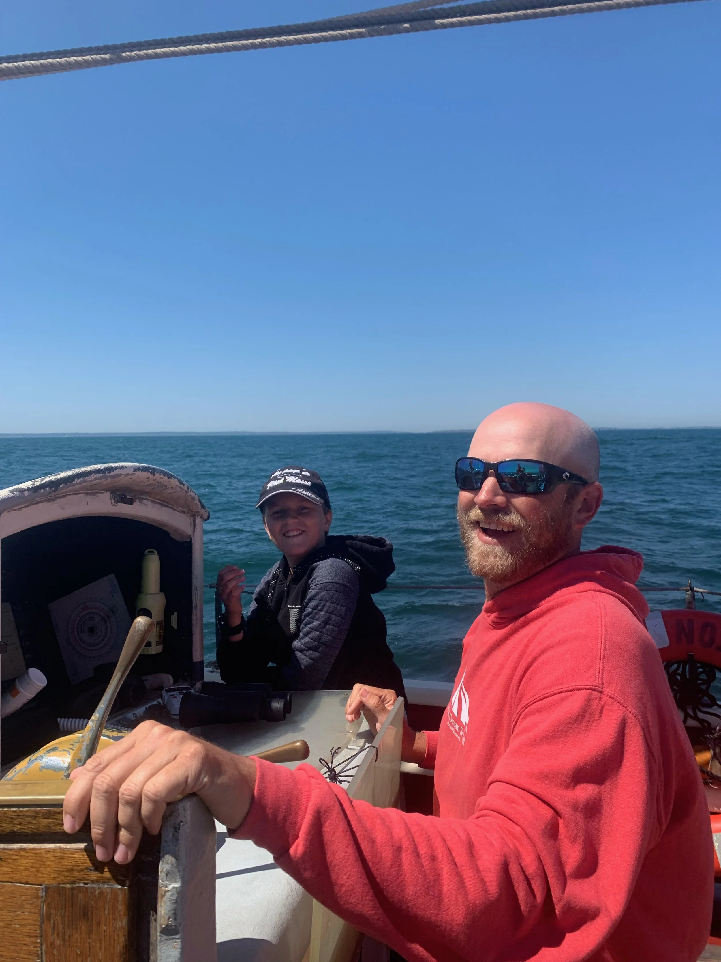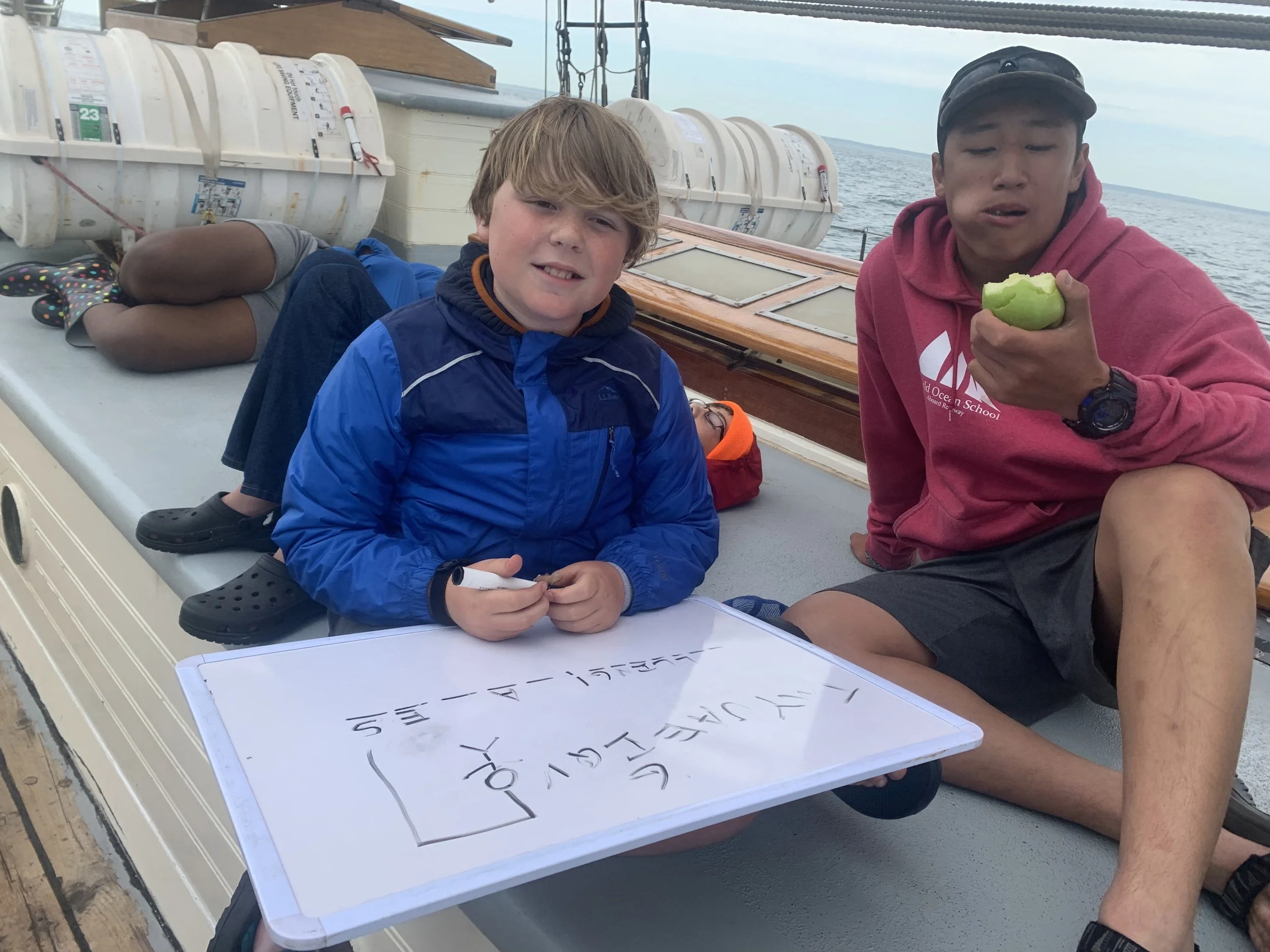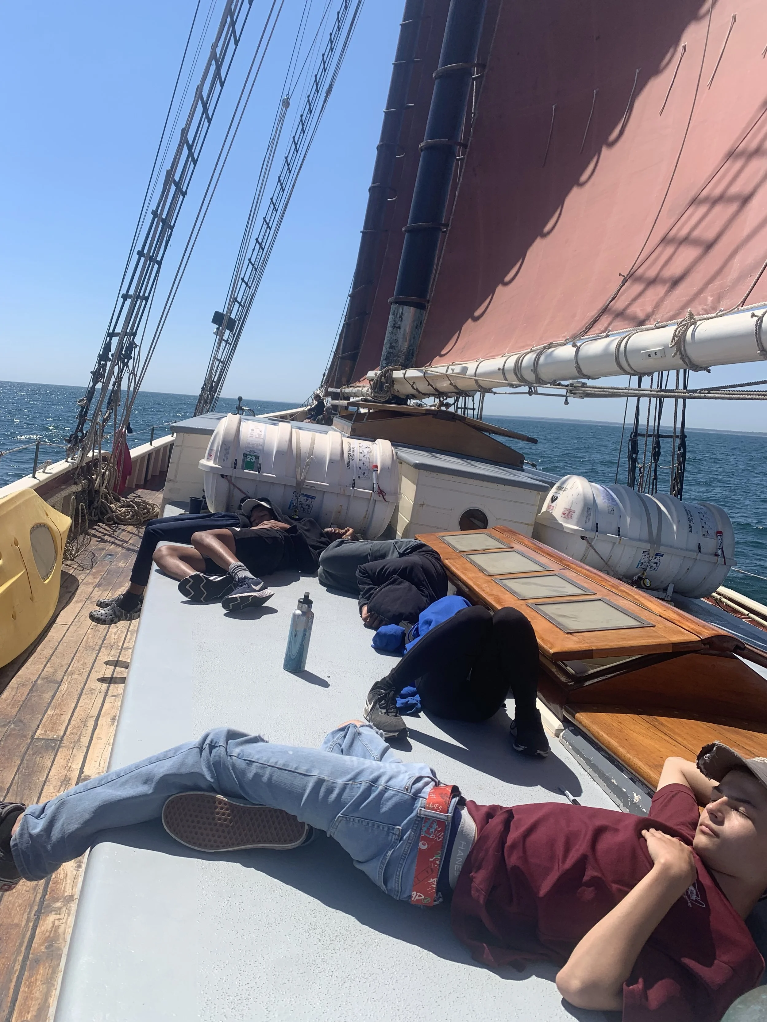 We woke up to delicious blueberry pancakes in Buzzards Bay. We caught crabs and a welch. We also got lots of waves and they were rough. We did sea-men ship and learned about knots. We learned the bowline, reef knot, and we learned about sharks. The sharks were Lemon sharks, Goblin sharks, Whale sharks, and the Basking shark. We also did active watch. We take the helm, do bow watch, just be on stand-by, and play hangman . We arrived at point Judith. We played wax museum, mafia, and the adjective game. We then took down the sails, got sunburned, and took naps. People got seasick and Sienna, Cat, and Ben took care of us! We also swam in calm waters that were mildly warm. We had dinner and it was buffalo mac and cheese, plain, and vegan mac and cheese. Jeremy the seagull almost attacked Hayahn. We watched Shrek in the salon! We took care of the deck and learned about the history of the Roseway.