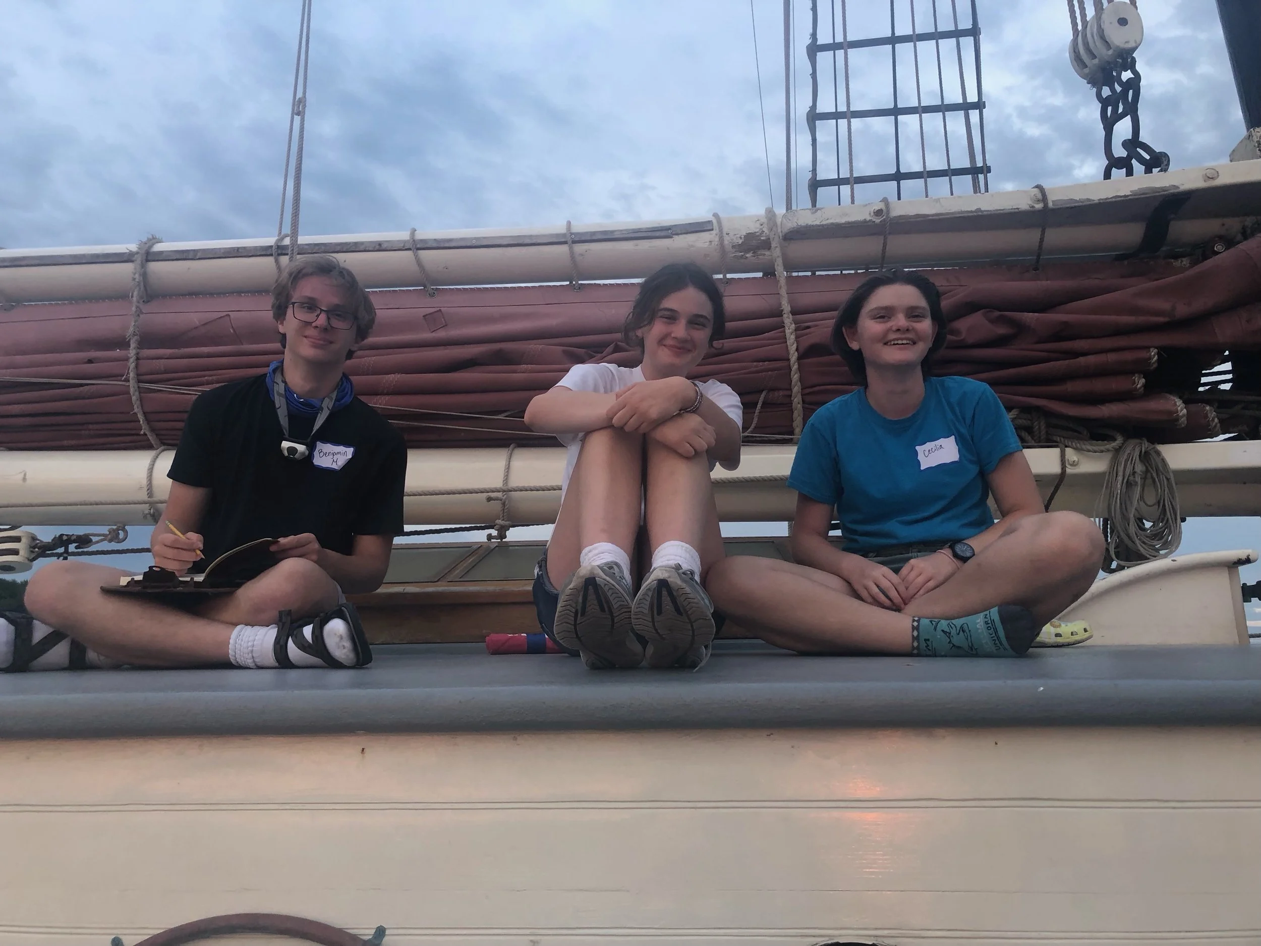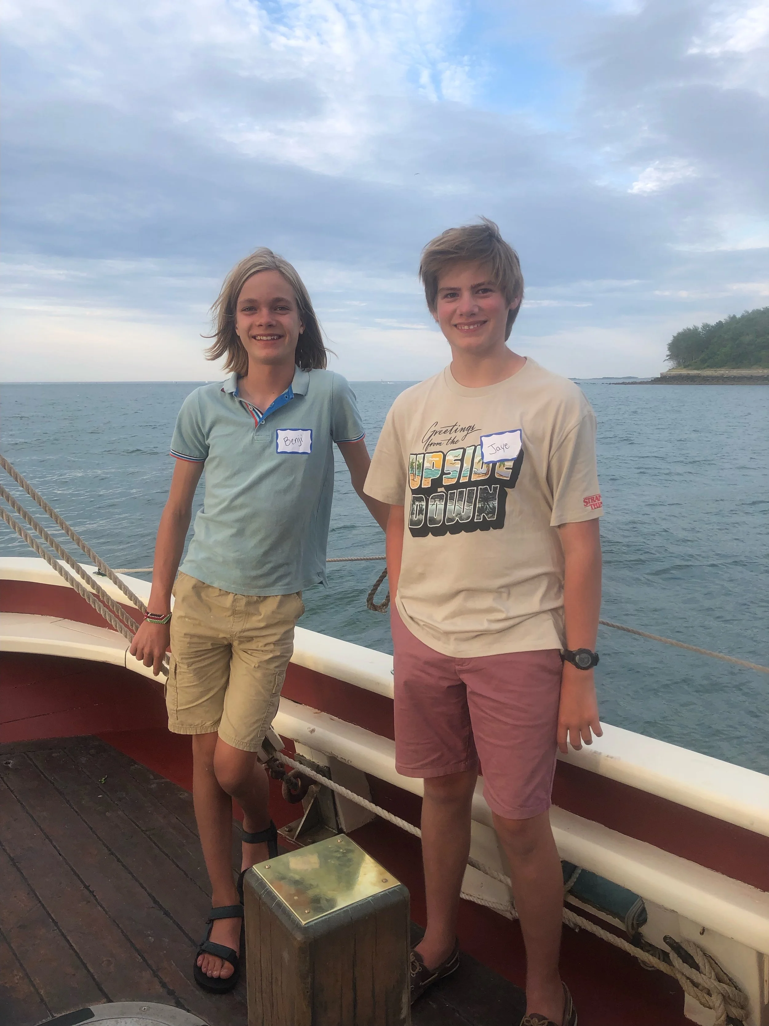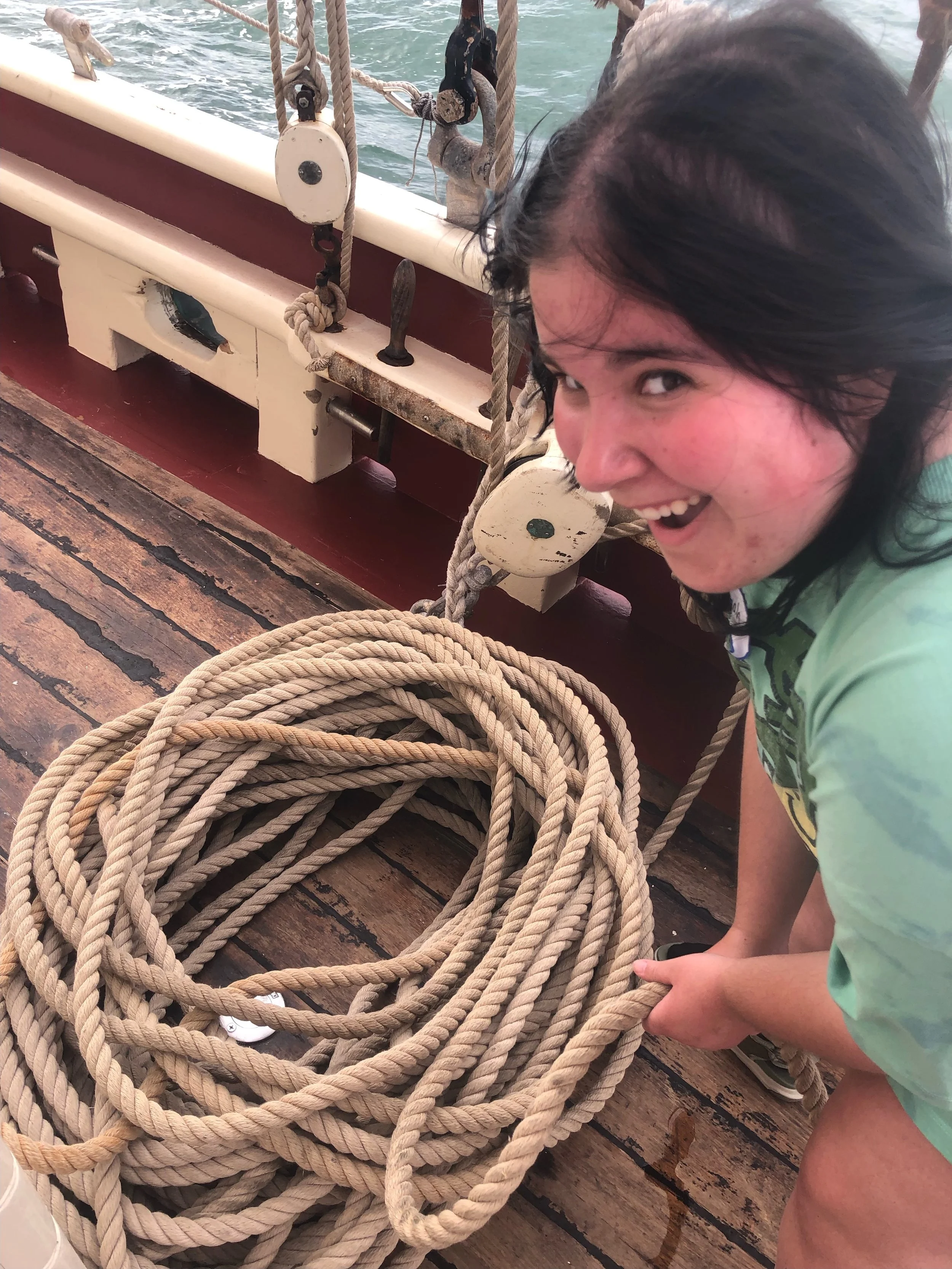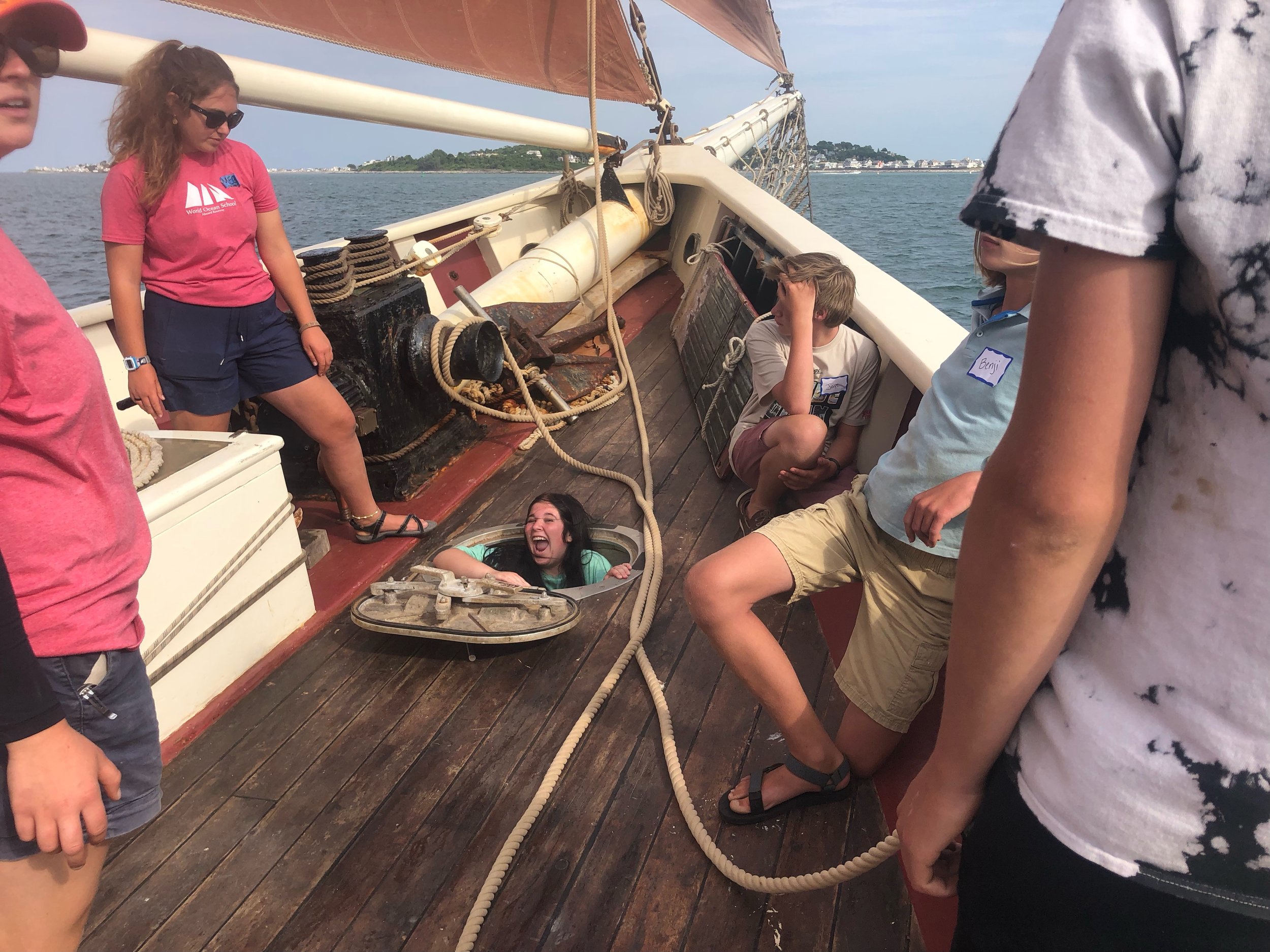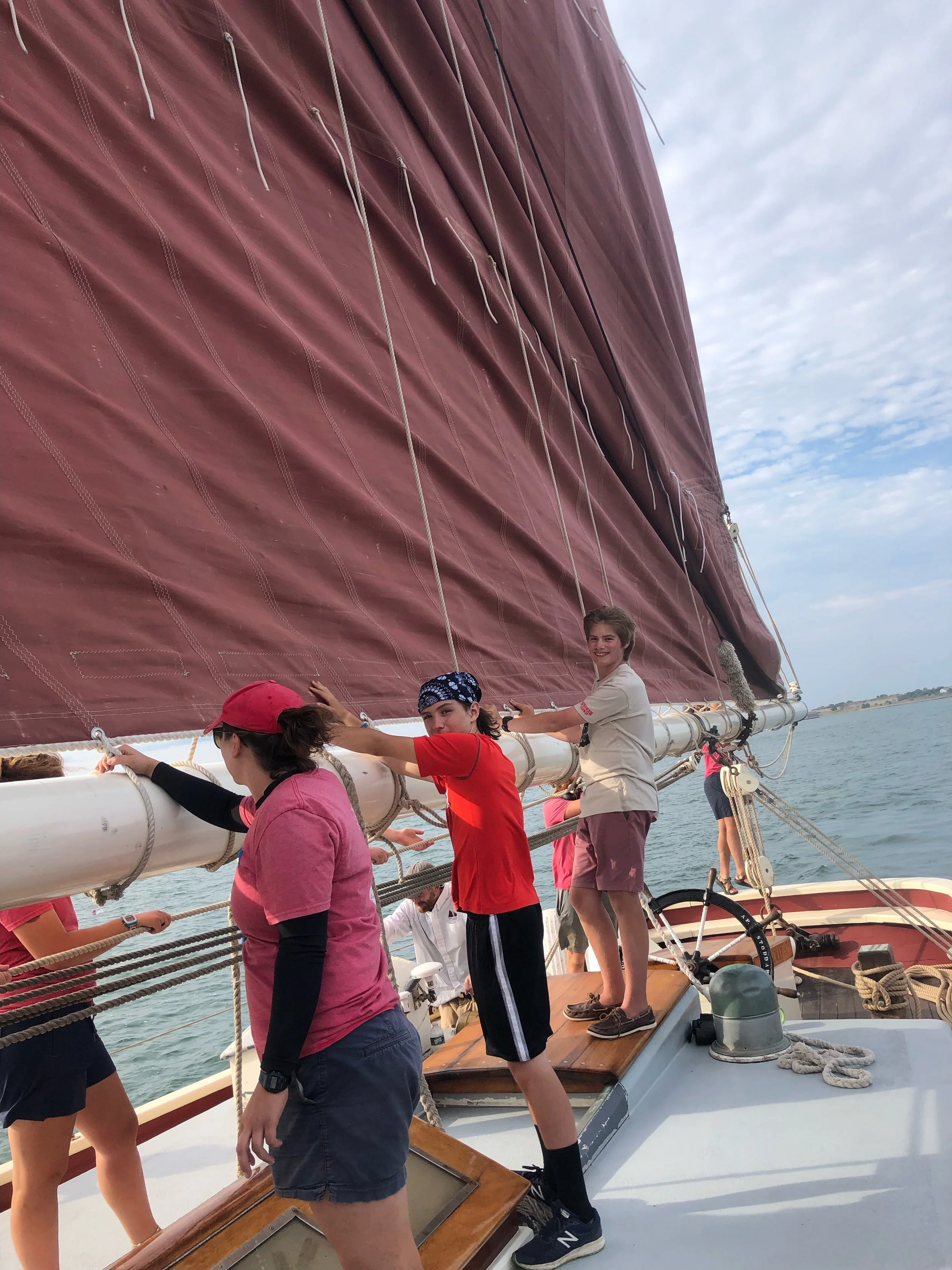 We learned all about the Roseway. This first day was heavier on the talking side as we learned so much. The Roseway has six main compartments these include the salon, fore peak, galley, fish hold, Foc’sle, and Main Salon. We got comfortable with where we were sleeping and learned all the nooks and crannies of the ship. The original plan was to head out to a harbor island and dock there. But there happened to be a party palooza that would have prevented sleep. Instead we anchored off Long Island and watched the sun dip behind the skyline of Boston.