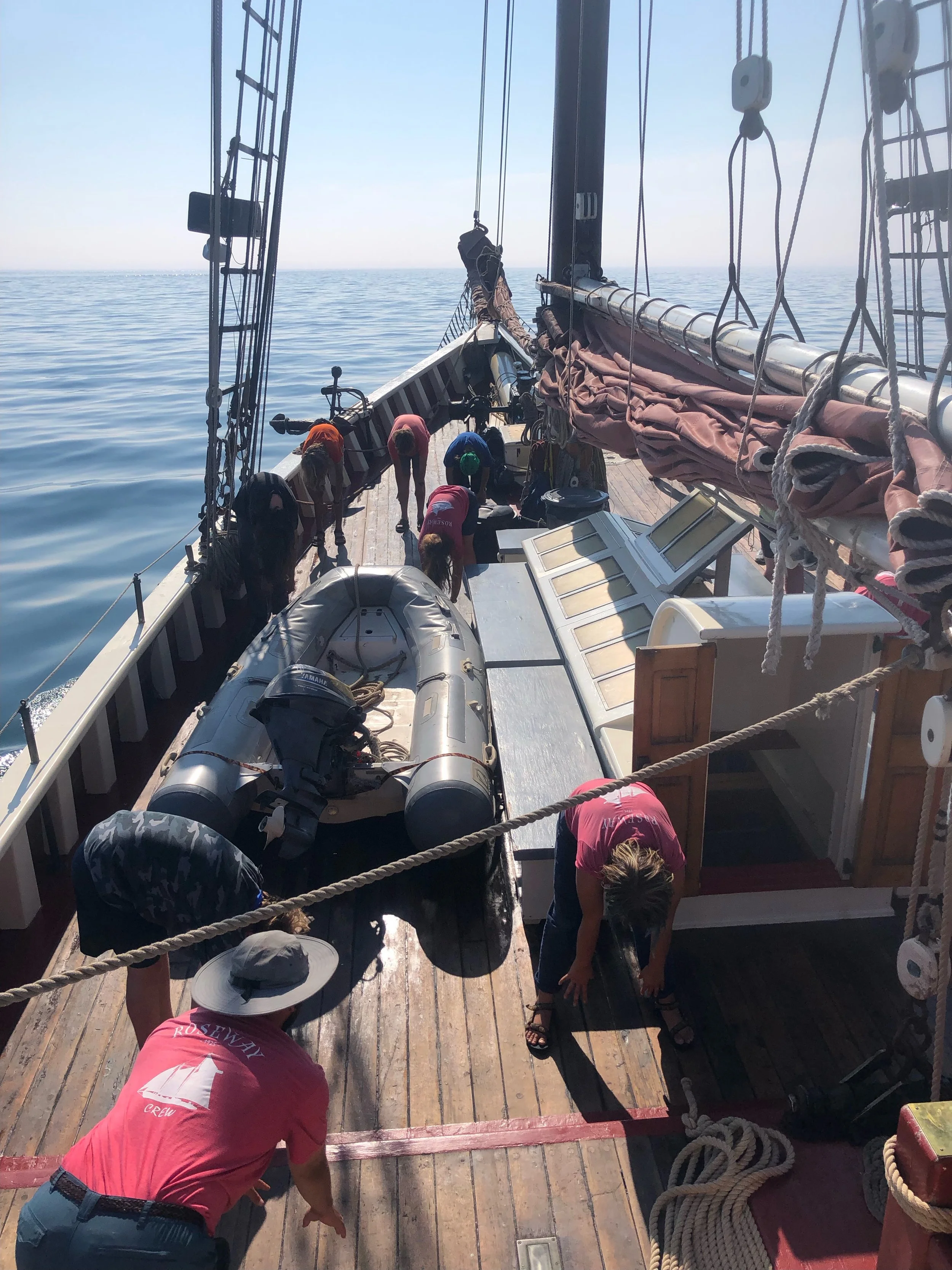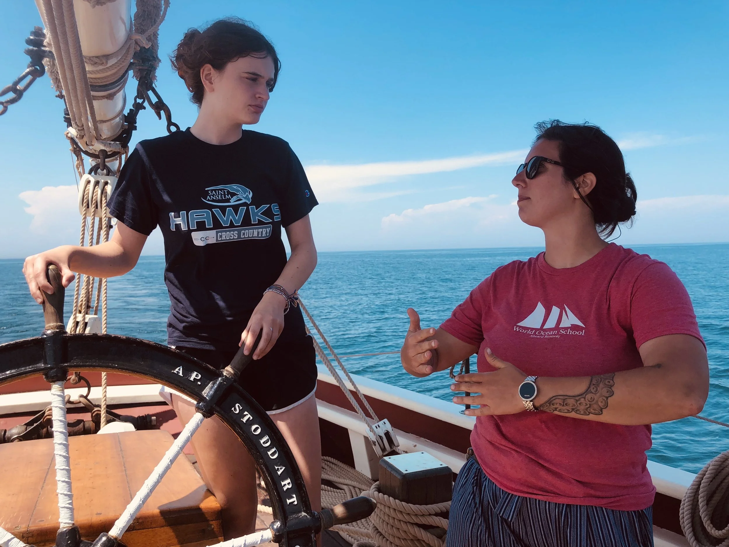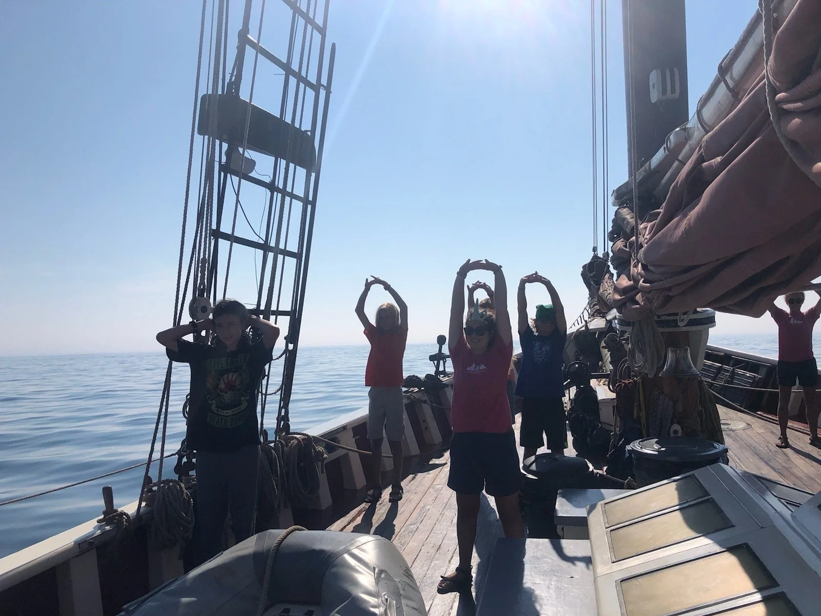 We woke up at 7, already moving out of Boston, and did our morning chore which was washing and scrubbing the deck. The other watches were responsible for scrubbing the soles (the floor) in the fish where we all sleep. Afterwards we had breakfast, had a lesson on navigation, and did some stretching with the whole group. After, we went on active watch. During active watch, we drive the boat, do boat checks, and handle sails. After active watch we got strapped up into harnesses and went on the bow of the boat, just when we spotted about 7 whales! At 12 we had lunch which was chicken with rice and bread, and then we started our watch flags (a flag that represents our group). Then we had ‘nibbles and knots’ where we ate and practiced knots, like reef knot, square knot, round turn and two half hitches. By then it was time to anchor, so we brought the sails down and dropped anchor in P-town. After we jumped off the boat and swam for about an hour and dried up on the deck. We had hot dawgzs for dinner and saw a great sunset. Then we had ‘spooky night’ and played mafia until anchor watch, where we had brownies.