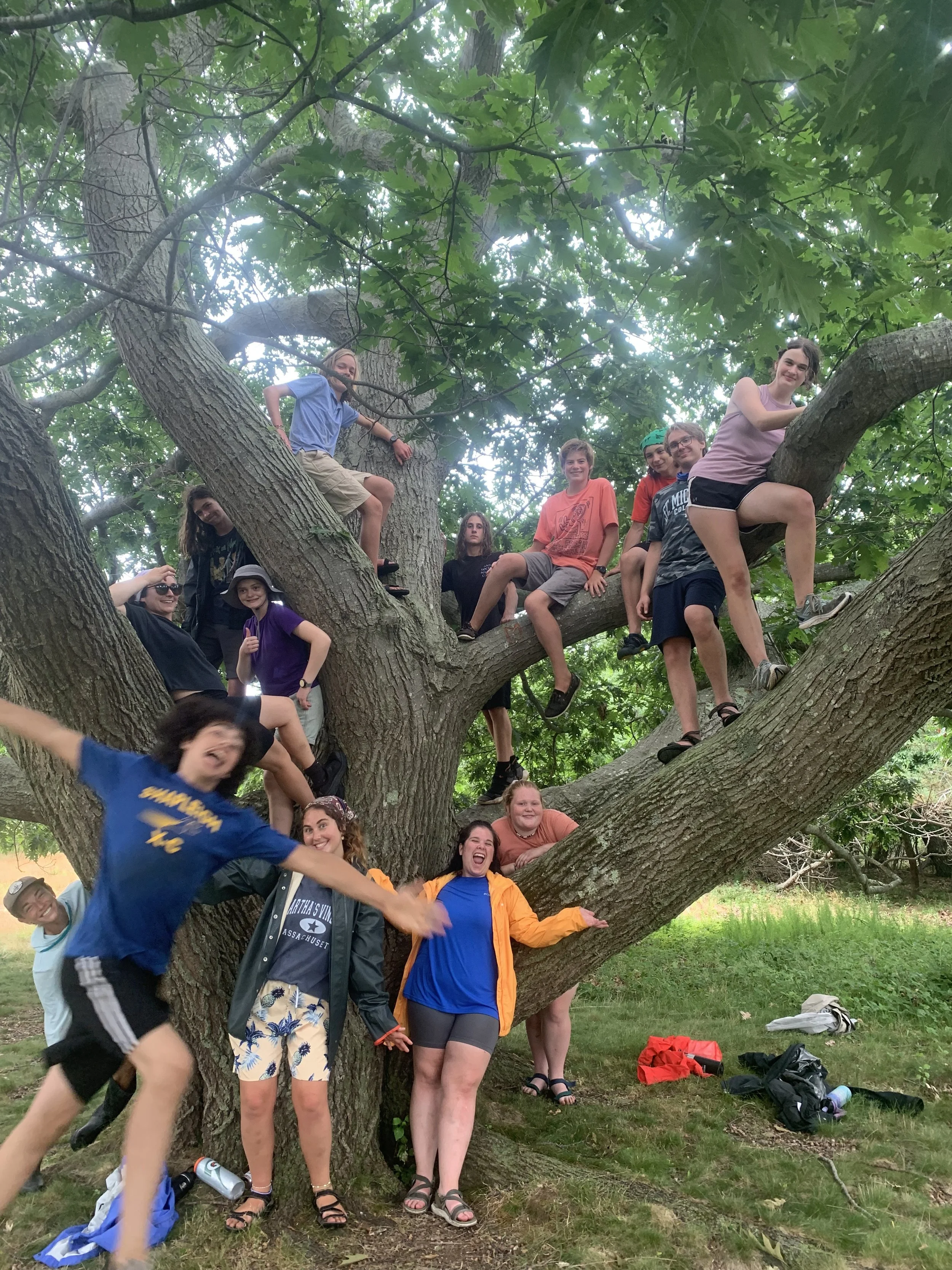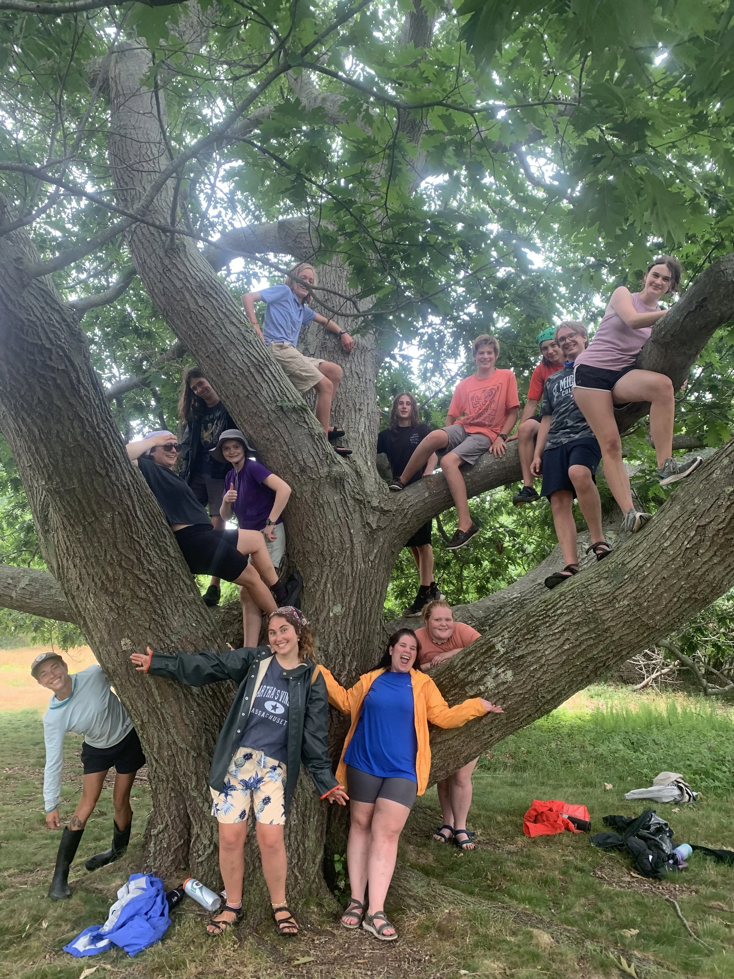 We woke up at 7, and we immediately set the sails. We ate on the deck, and had very delicious potatoes! After breakfast we got assigned our chores and completed them. Then we went into our watch rotations which included active, seamanship, and R&R. During active we did bow watch, but since we were sailing in the open ocean there wasn’t much to see. Then during seamanship we removed and learned where the different lines and pins were, and their function. During the watch rotations we spotted pod of porpoises! On the radar that day it was showing that a small storm was coming towards our boat, so we lowered the sails during the watch rotations. We then had lunch which was bread, veggie sticks, and falafel. We anchored near an island called Great Misery, by that time it started drizzling, and we got ready to adventure on it. After getting across the water to the island, we walked to a field and played capture the flag. It was crew versus students and in the first game the crew won, and in the second game the students won. After playing for a bit and having a snack break we took a walk around the island and saw a big live oak tree. We climbed it and took a photo of everyone on the tree while trying to guess its age, in the end we assumed it was a couple hundred years old. We continued walking and saw a hotel casino ruin with many names engraved in it. Then we got back on the boat and the rain had gotten stronger. We had dinner in the saloon which was barbecue chicken, cornbread muffins, and mashed potatoes. We were given our evening chores ,and after finishing those we had our evening muster to discuss what the next day would bring. Then we played a game called adventure island, and hung out before heading to bed at 10.