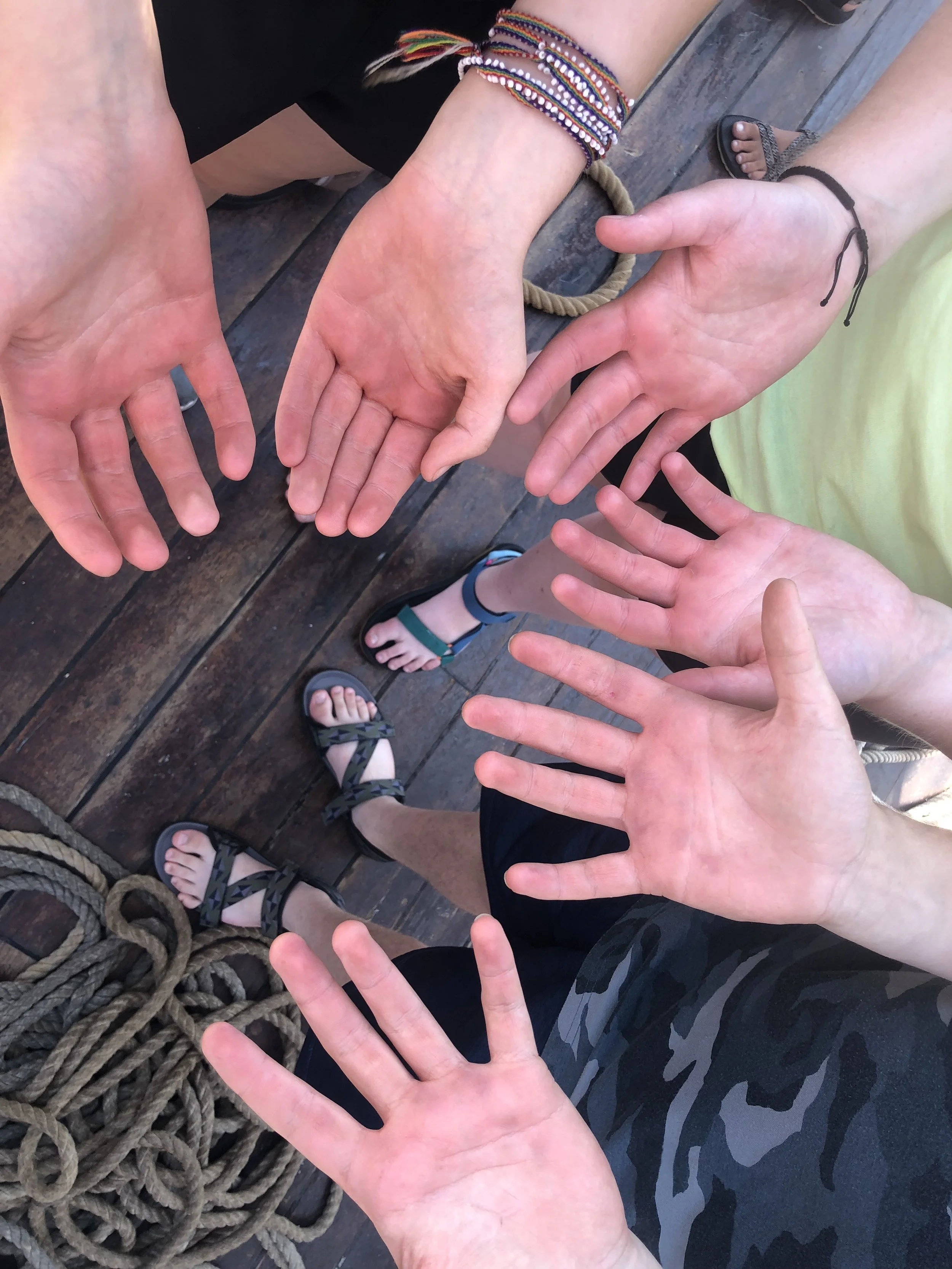 Red hands after hauling lines to raise sails