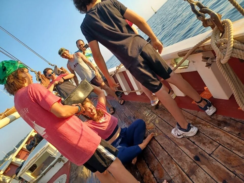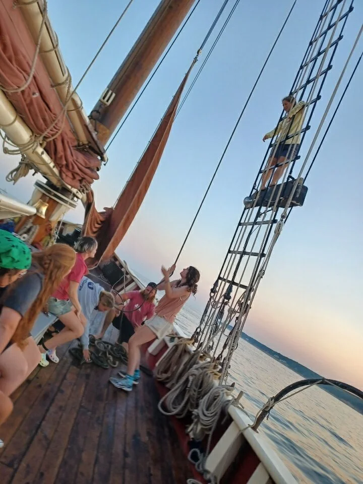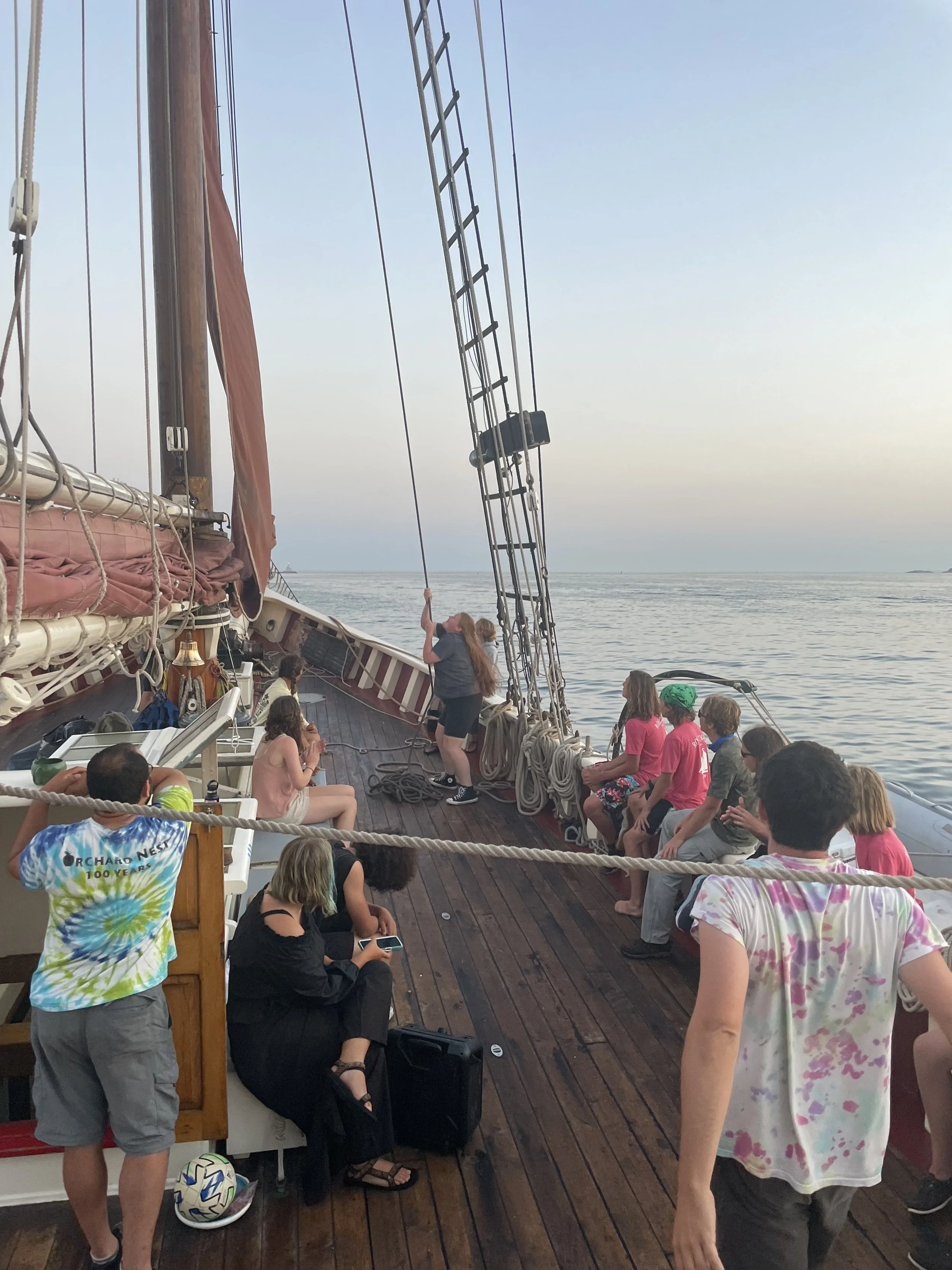 We woke up today at 7:45 am which is a nice late wake up. We were in Rockport. We hauled up anchor right away and because of the poor wind we motored past Thatcher Island to Gloucester. We had a final day swim call and hung out in the water playing ball! Also at this time we saw Roseway’s sister ship Adventure sail by. After swim call we had lunch and then during dishes got ready to go on land. We got onto the dinghies and drove into Gloucester. Once on the dock we got a tour of schooner Adventure. We noticed that Adventure was really similar to Roseway but it was much wider and there was no bowsprit. Adventure has much more space than Roseway below deck and seeing the differences and similarities was cool. Then we walked in the sweltering heat and went to an ice cream shop. With delicious ice cream in hand the group split into playing on a field, and walking further into town. At the field we played basketball and tried to get in many half court shots, and into town we checked out a cool bookstore. We got another look at a different schooner, the Thomas E Lannon which was really pretty and had a cool compass in a beautiful glass case. Then we met up at the dock to get back on Roseway. We ate buffalo chicken mac and cheese, and then did our evening chores. We then had a few minutes to train for the deckhand olympics that were taking place that evening. After the opening ceremony we had the events which included knot tying, finding pins, blindfold bucket toss, and dressing a deckhand. We were all tied by 1 point, but in the end B watchgroup won! After that we had jumbo setting races where everyone went up and tried to raise the jumbo sail by themselves. The shortest time of the night was 29 seconds with a group of 4 students. Then we put on some music and started fishing for some squid and one squid was caught, but we did release it in the end. After that we all hangout until nighttime. Some people slept on deck.