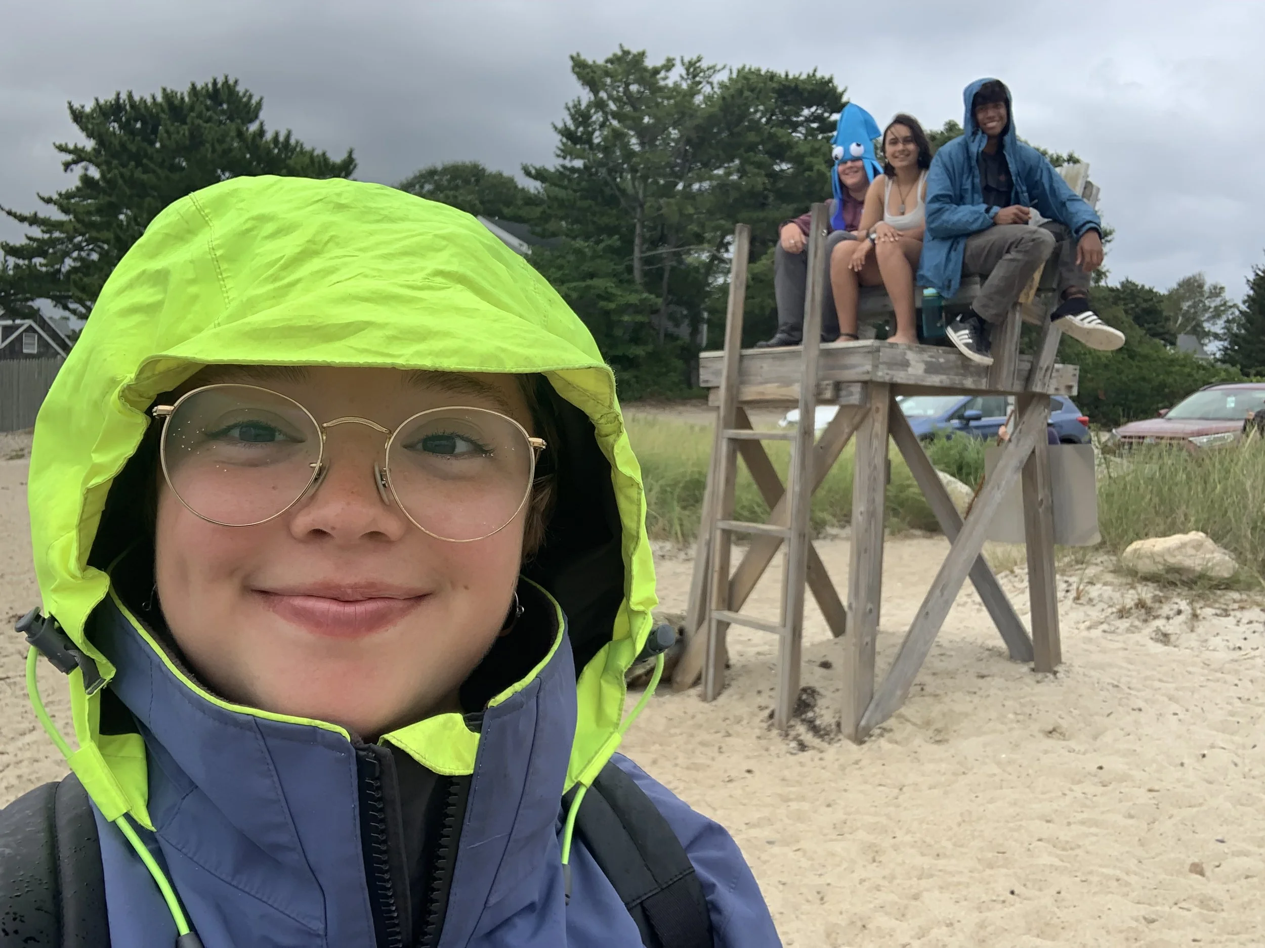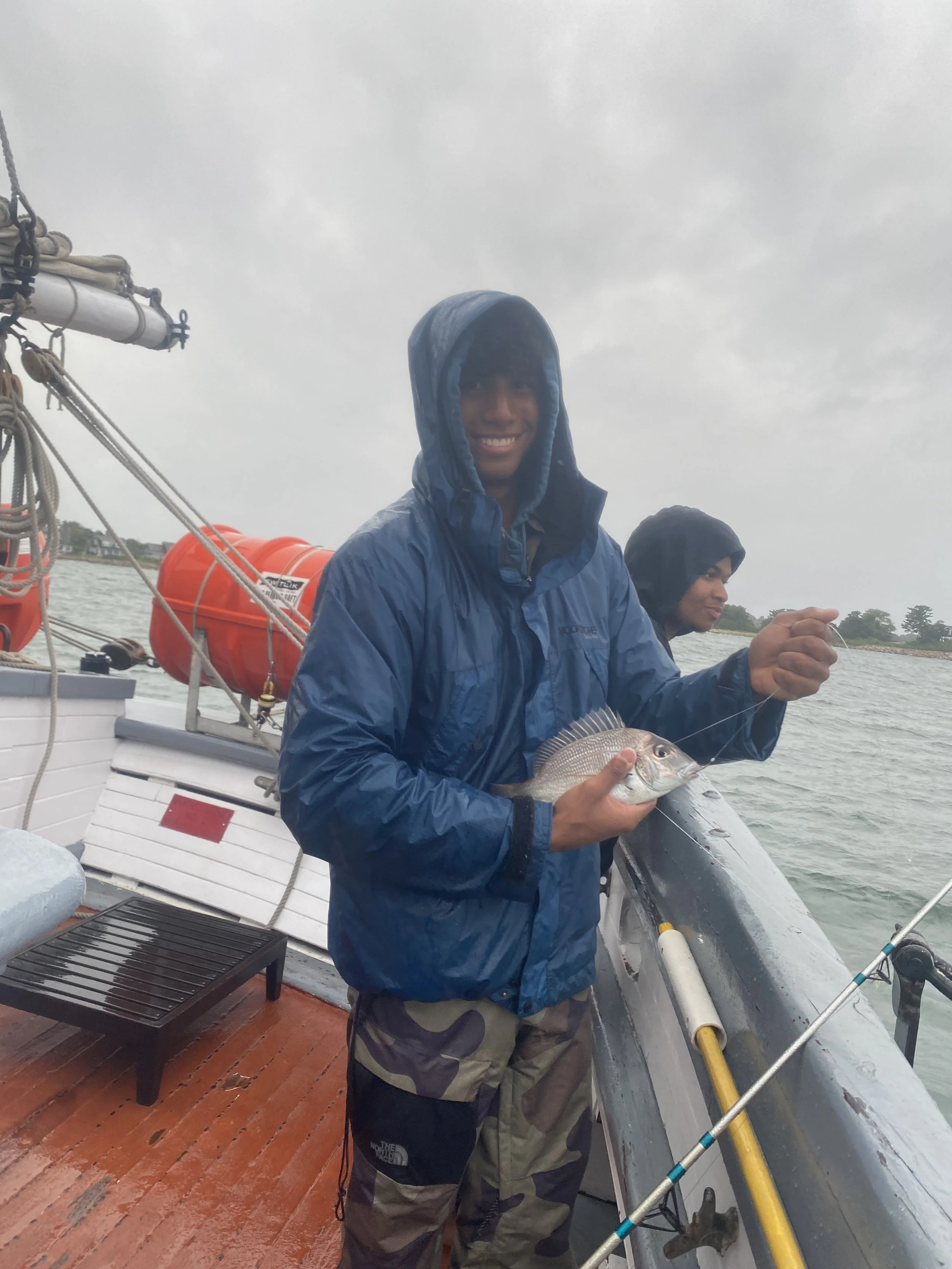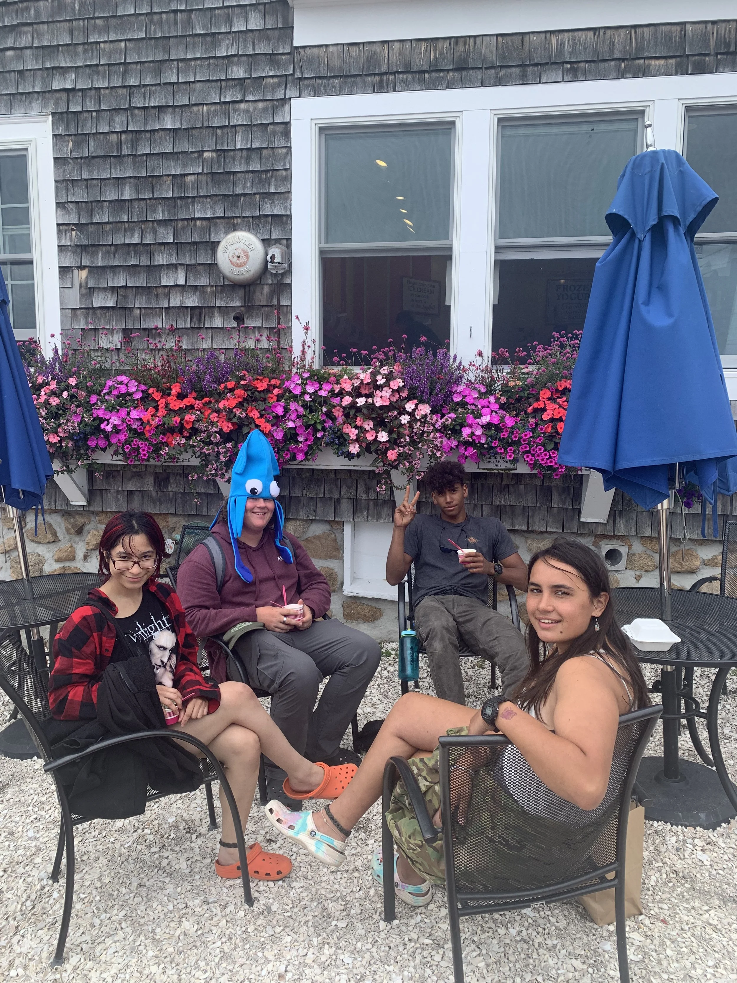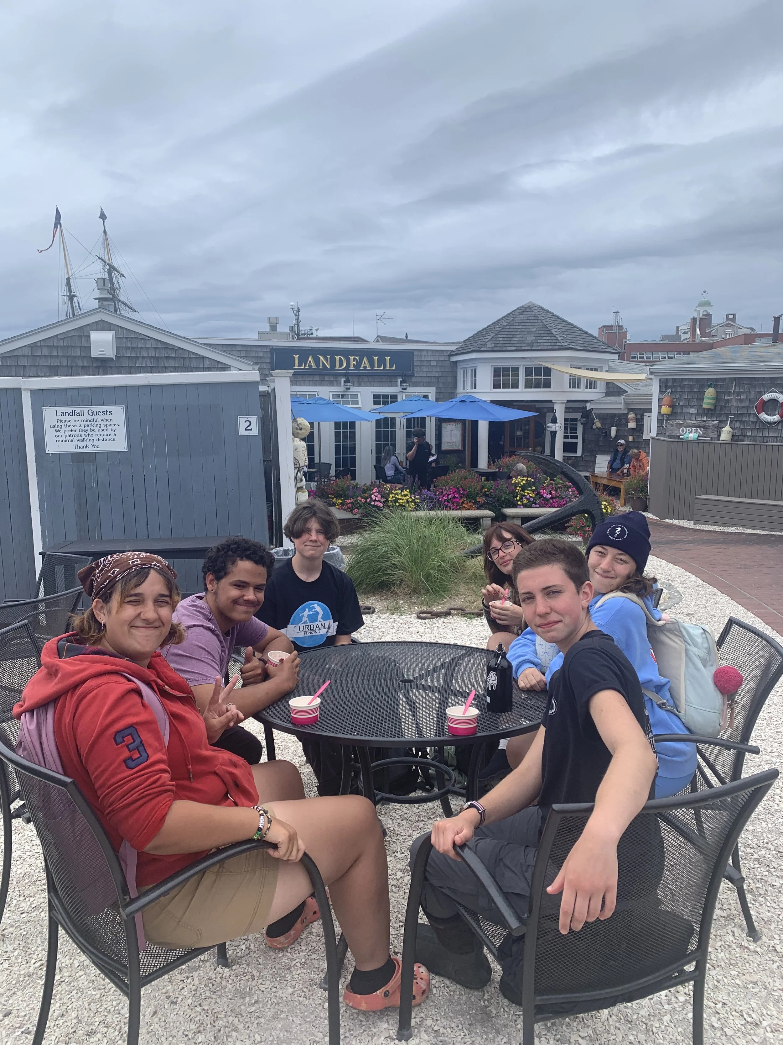 August 20: Today we ventured ashore. After a night anchored in Buzzard’s Bay close to Wood’s Hole, we took the red power boat to the shore in shifts and walked into town. There we went to the Wood’s Hole Oceanographic Institute (WHOI) and listened to a presentation about who they are and what they do. Turns out WHOI was the group to find the Titanic, and have swapped it with the sister ship, the HMHS Britannic. After the presentation, we ate our packed lunches on a nearby hill; PB&J, cheese and ham, fruit, nuts, etc. Upon finishing our mid-day meal, we explored Wood’s Hole in groups of three. In fact, much of A Watch remained together as we visited axolotls in a visitor center, got a postcard, and promptly mailed it. ICE CREAM! NOW IT WAS TIME FOR ICE CREAM! We regrouped at an ice cream shoppe, and all purchased scoops on World Ocean School’s dime. Most of us chose mint over coffee adjacent flavours. Consensus; mint is better. Mason and Sophia disagree. Vivian does not. After ice cream, we made haste to the aquarium and saw a boat load of fish. There was a seal, a real seal, not the Navy kind. It rained, and the sad seal was named Bubba. We waited for Captain Greg Terry to retrieve us at the beach, and shortly after the rain picked up, we all arrived, in one piece, at the ship. Half of the group went into the hold to dry off, whilst the rest of us jumped into the boundless and salty Atlantic! All dry, we mustered for dinner, which was pasta with broccoli and chicken. Yum, yum, yum, yum, yum! Wait. Hold the Log Book. Wyatt isn’t here! We all peer over the edge of the boat, and lo and behold! A giant squid has dragged Wyatt by his luscious locks, bound for Jean Le Stinkfoot’s lair! Captain Greg wasn’t quick enough, and we watched in horror as the leviathan slipped through his fingers and into the horizon. Will Alexis be the hero and brave the deep to save him??? Or will he perish in this mysterious abyss, lost forever??? Tune in in three days to find out!
