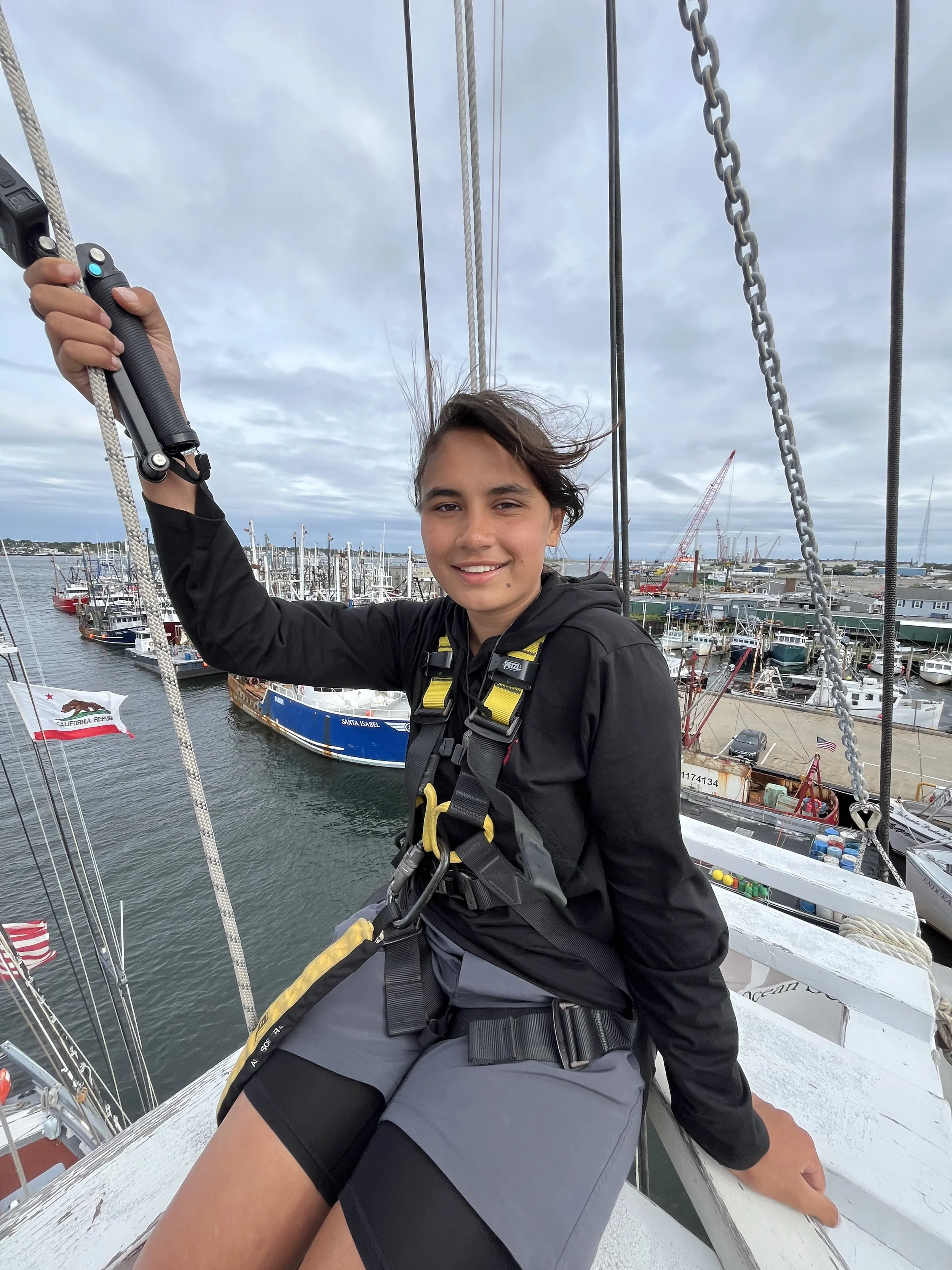 hello, today we got to eat the squid we caught and some blue fish it was absolutely delicious and tonight is movie night. We will vote later. We also went aloft today right now in New Bedford and tomorrow we go into the town. Yesterday we were in Woodshole. We went to the aquarium and WHOI, a research institution and we also got to walk around town and get some ice cream. I got strawberries as always. I've learned so much and had so much fun and will continue to with this amazing crew of students and teachers. I miss you Mum and Dad. I will see you soon.