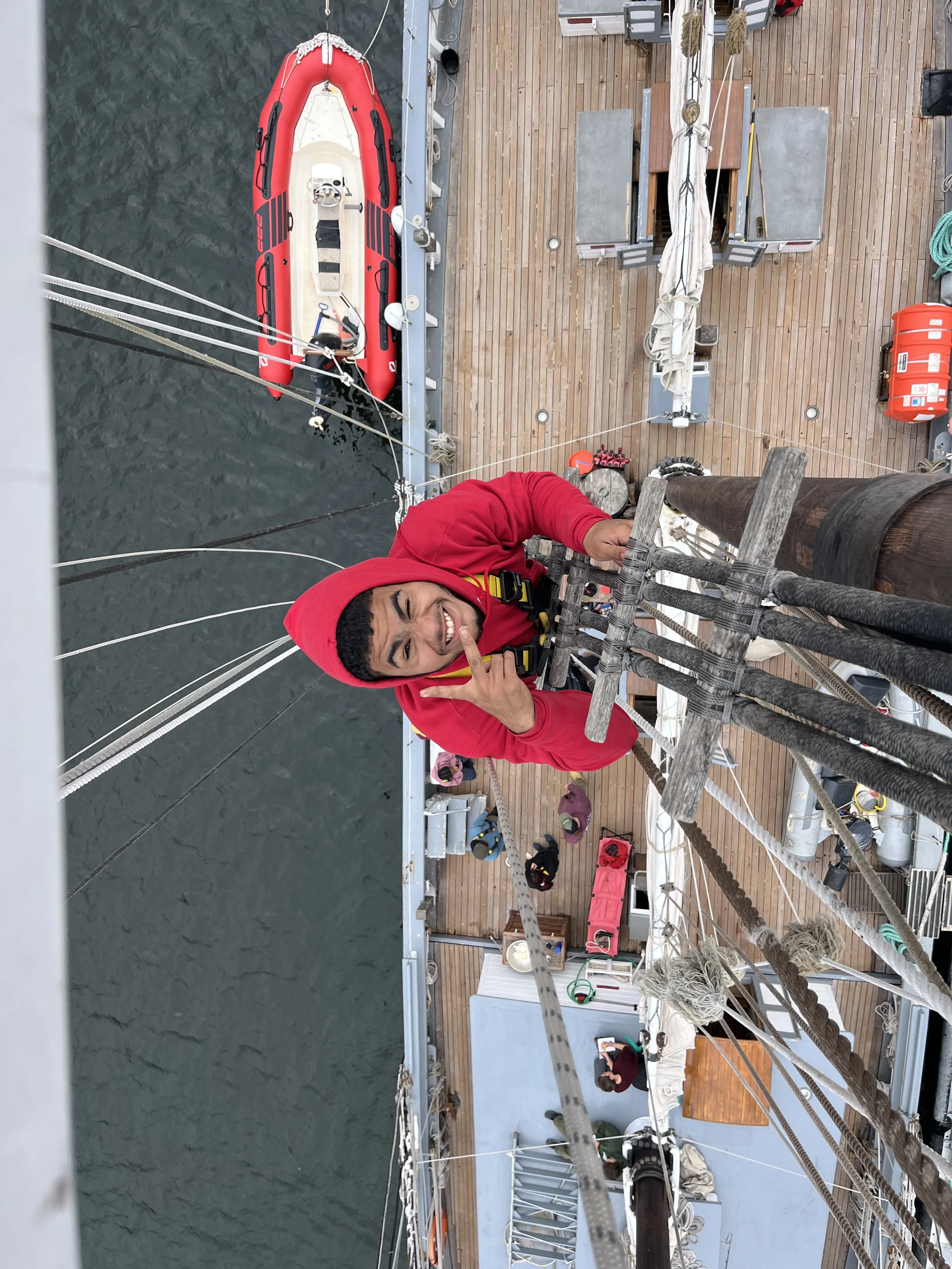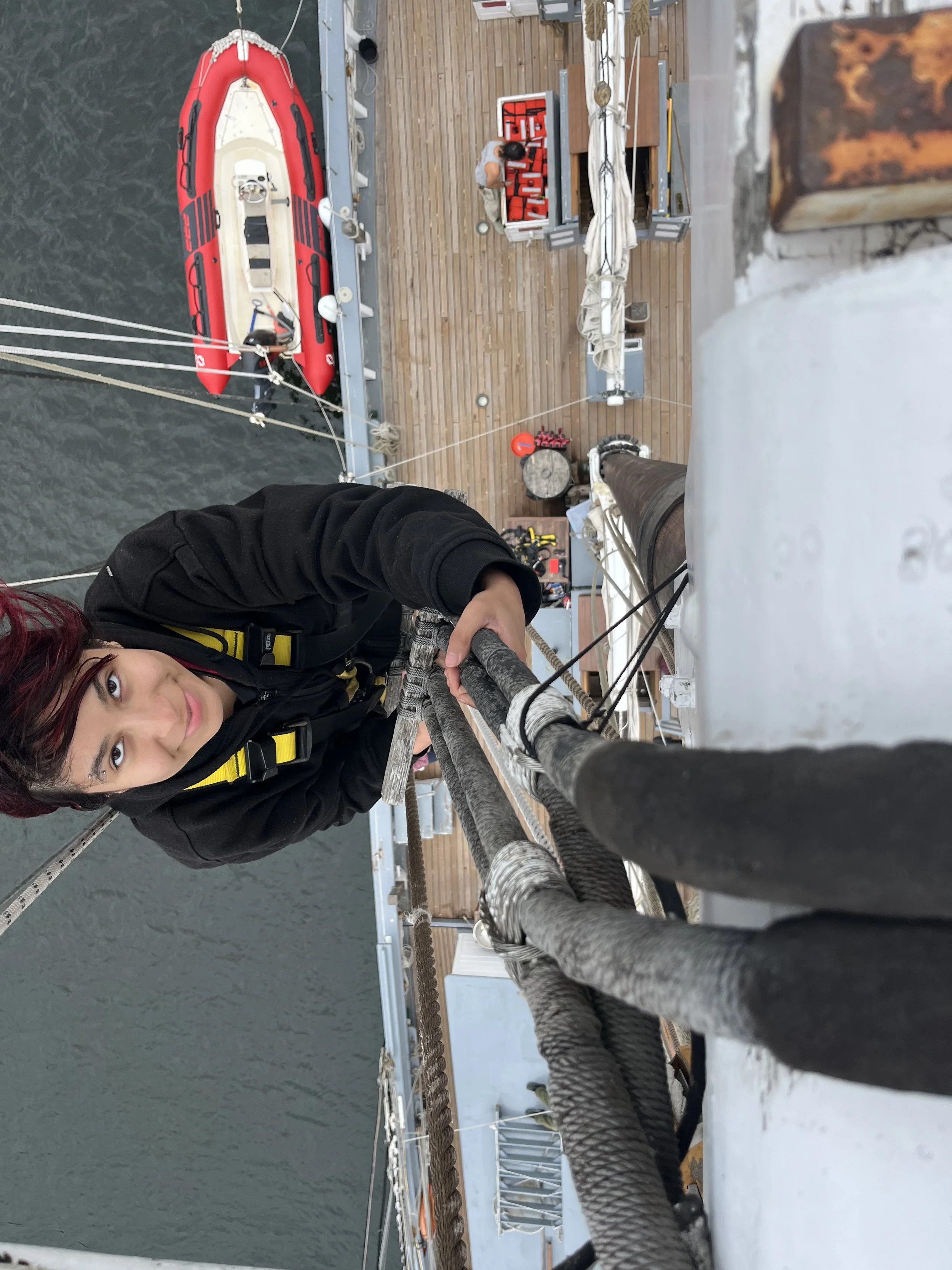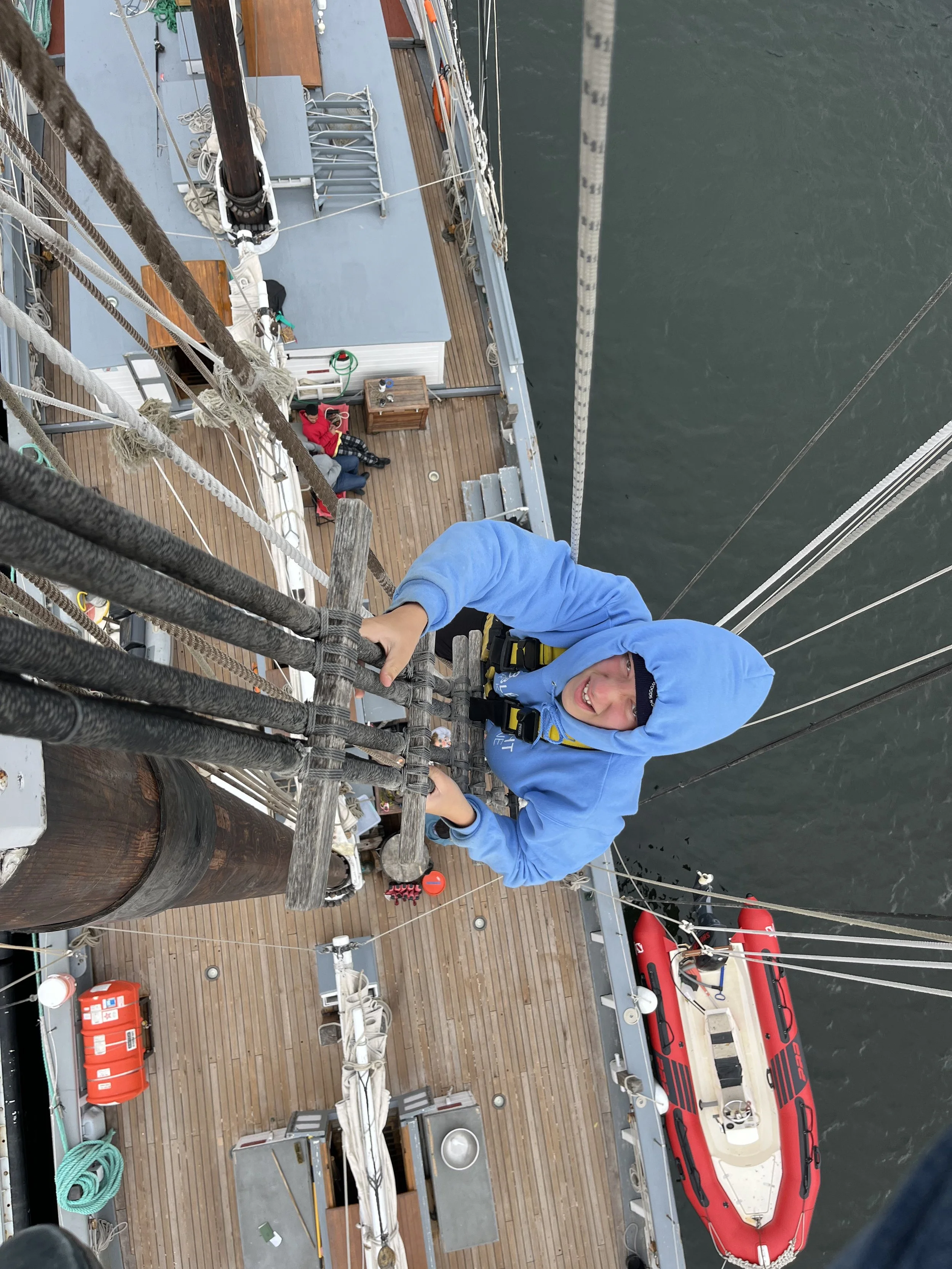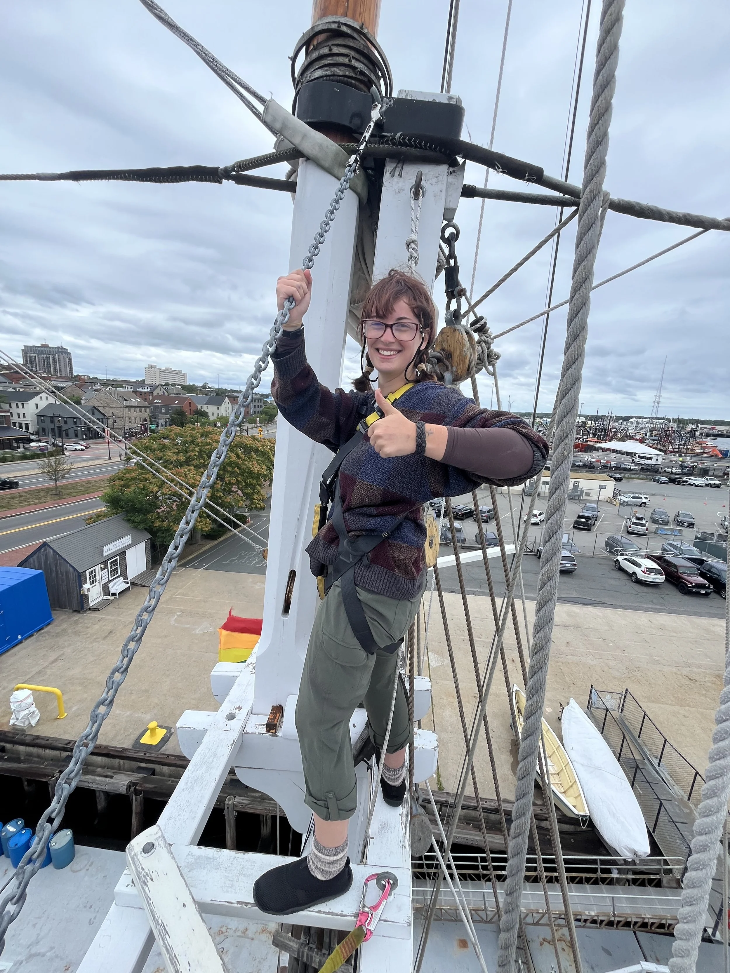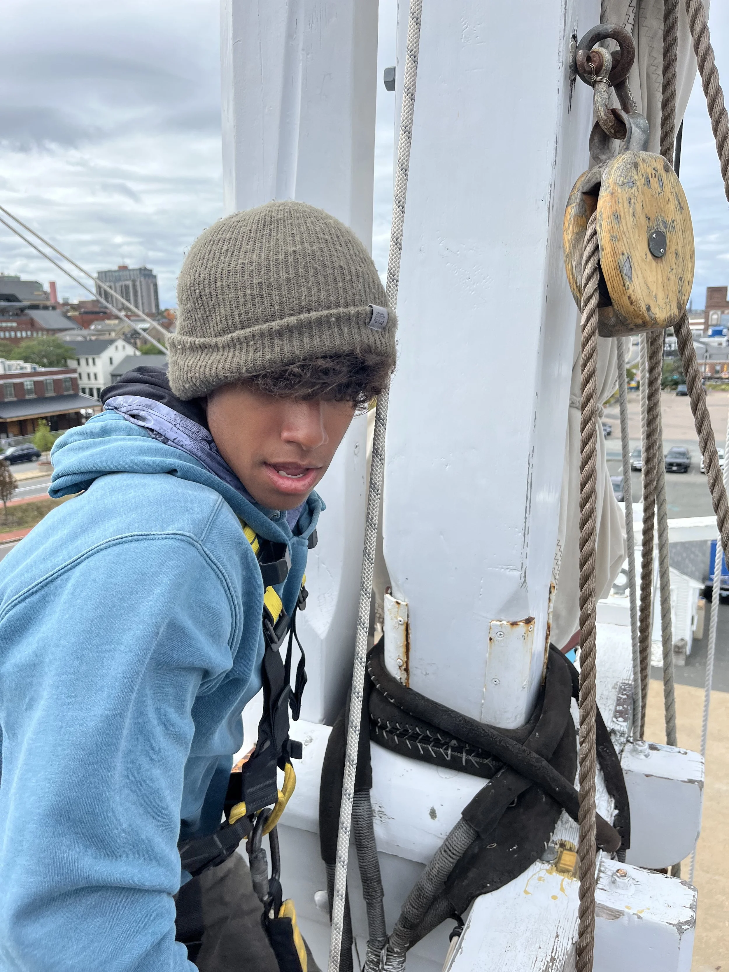 Hello everybody, Today was really tiring but it was fun. We had just docked in New Bedford as we needed to get away from the hurricane but thankfully New Bedford has a Seawall that will cover us from all the bad waves. We got to go on the top part of the mast that we call a loft. I took a picture up there ( i will show when i get home mom dont worry). All was well . I've learned a lot here and can't wait to do more. P.S Love you mom.