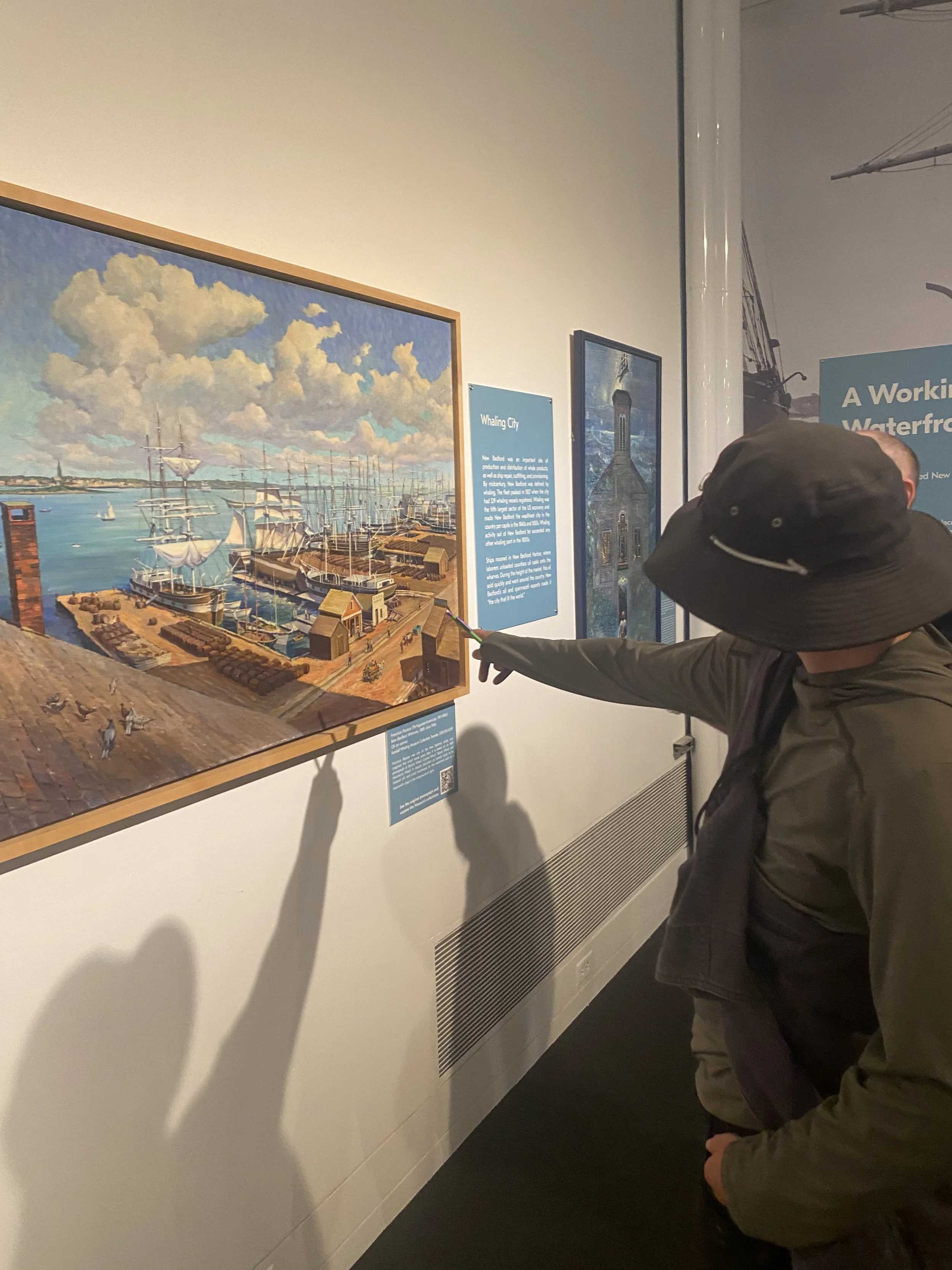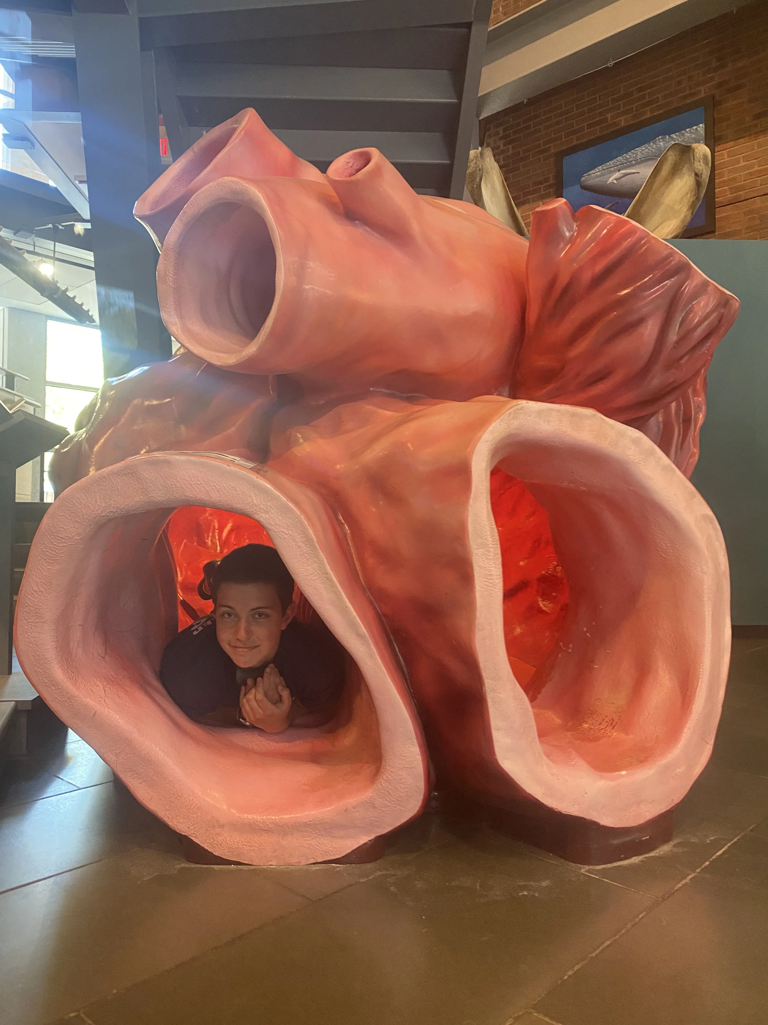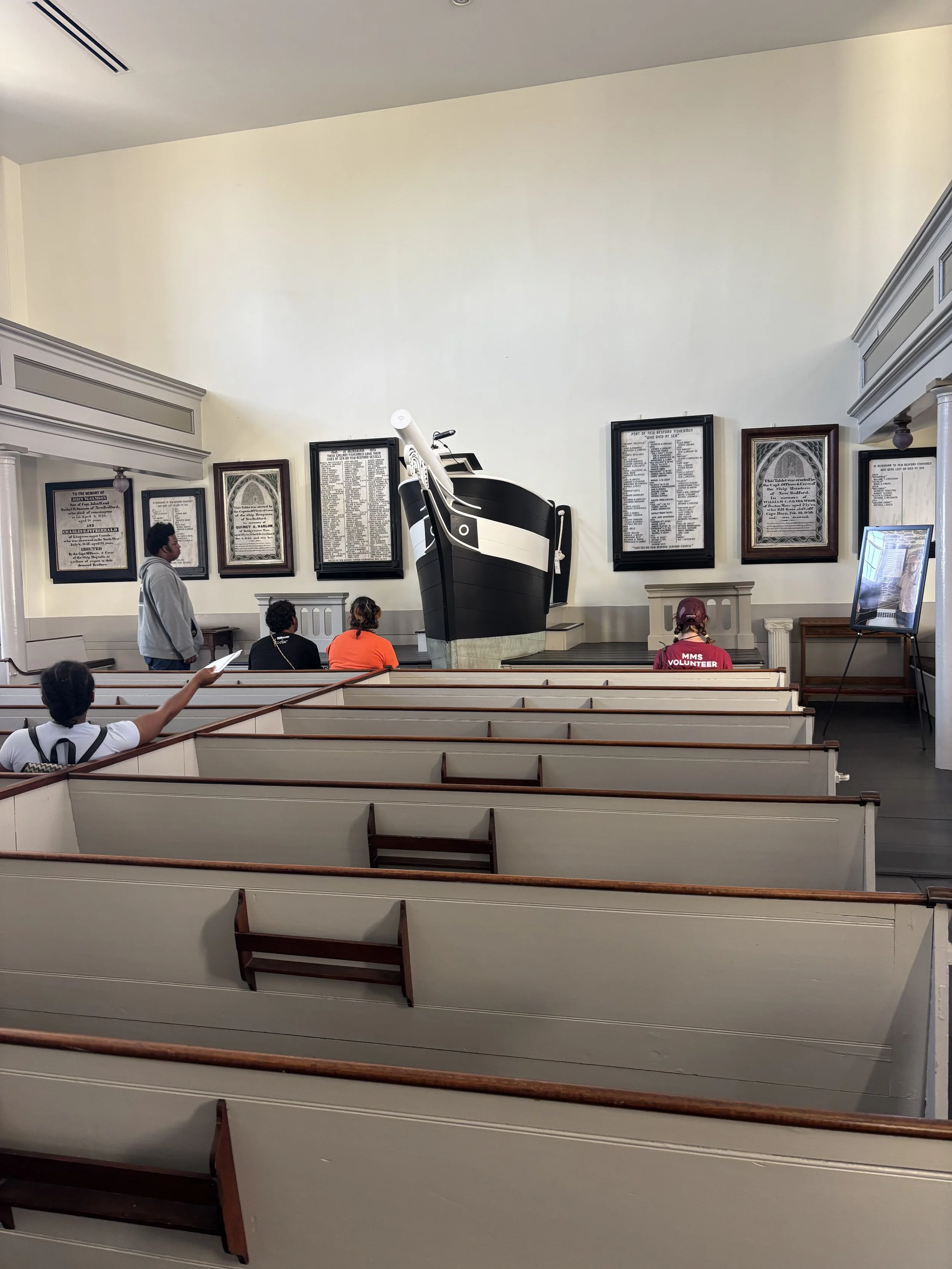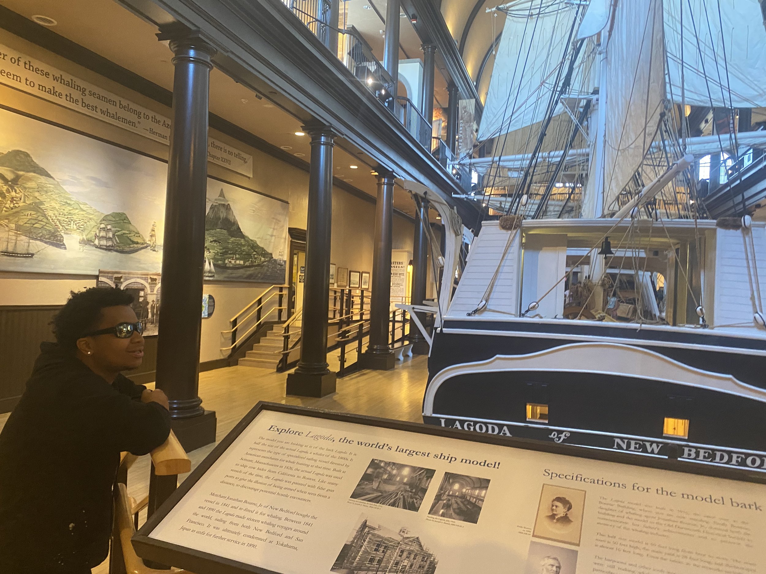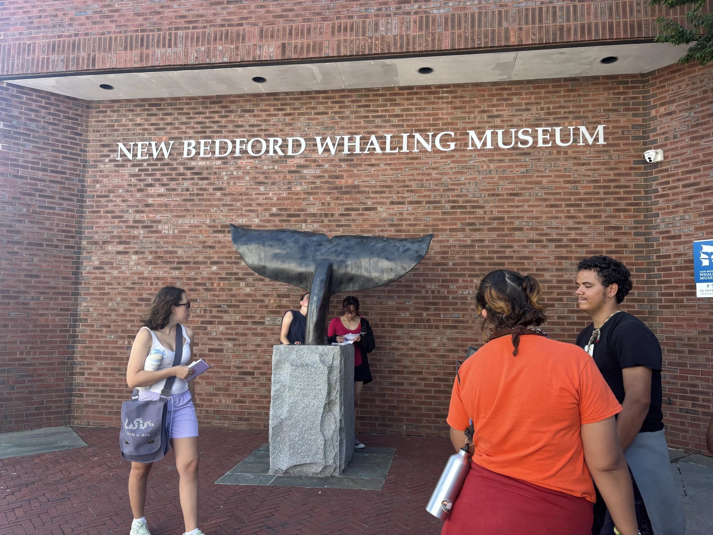 Our Friday was spent on a shore excursion in New Bedford visiting the world-renowned New Bedford Whaling Museum and doing an art walk through town. The weather today was the most pleasant we’ve had in a while, sunny and warm with a nice breeze. Some of our favorite pieces from the art walk were Sea Flower by James Surls and the Blue Man Holding Heart by an unknown artist. A fun fact from the whaling museum was that up to one third of the oil that can be harvested from a whale is stored as solidified deposits within the whale's bones. These reserves function similarly to a camel's hump and provide nutrients to the whale in times of scarcity or migration. KOBO(King of the Blue Ocean), a 4-6 year old blue whale who was killed by a ship strike in the 2000s and whose skeleton is on display at the museum, has been slowly dripping oil for the past twenty years and scientists estimate that he will continue to do so at least until 2060. We ended the day with an ice cream stop which was awesome! Now that hurricane Erin has passed, we’ll be sailing to a place called Scraggy Neck tomorrow. Hopefully we’ll get a beach day.