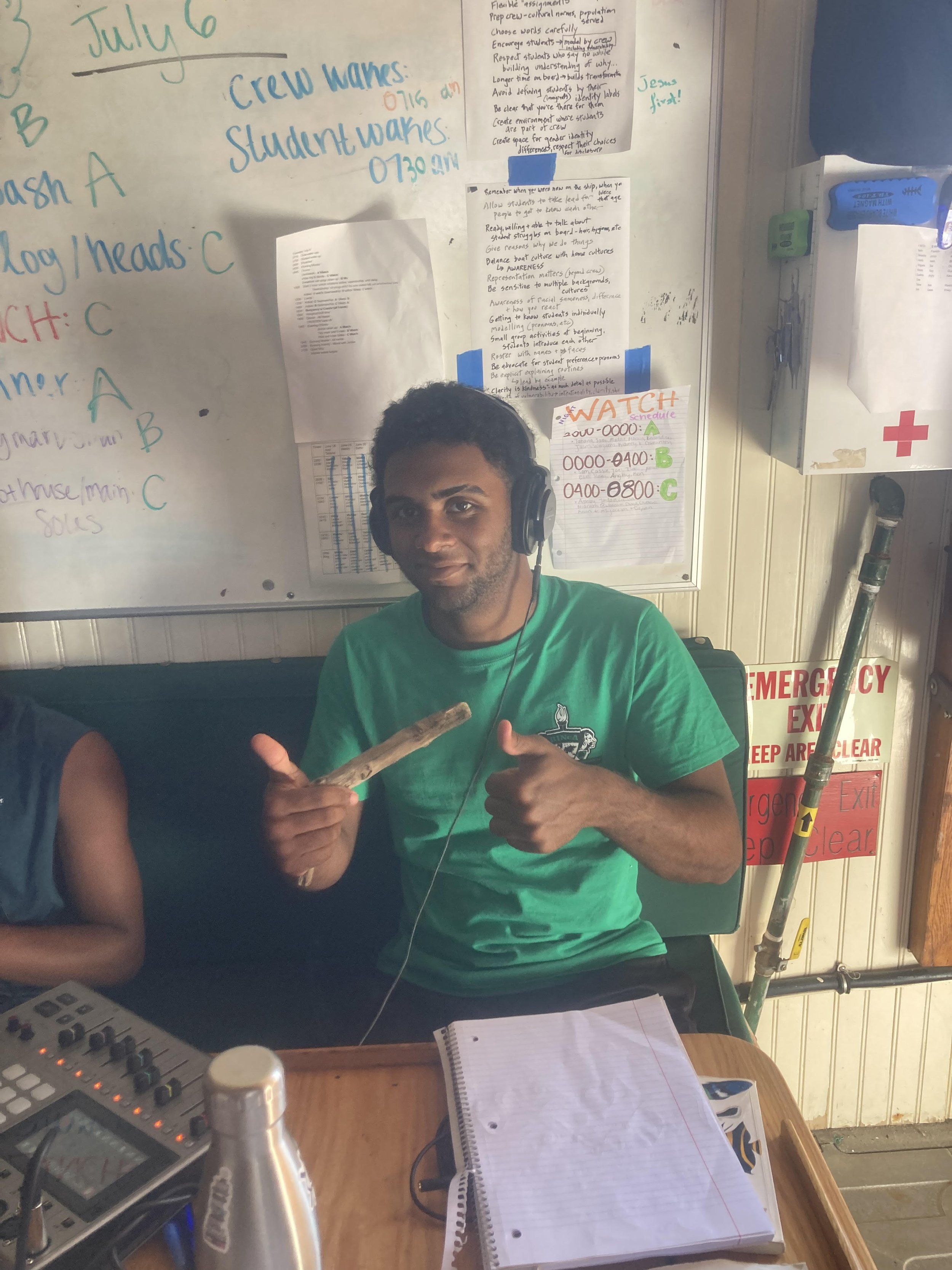 Yesterday/today we (my group) did night watch which means sailing at night, we stayed awake for 4 hours and there were three groups A, B, C my group was from 4 am until 8 am I was able to see the stars and the sunrise we also sailed through a fog and not to see anything in front, sides or behind the boat, we even saw some trees in the sea and that was strange, then we saw some sharks drinking and that was the night watch .