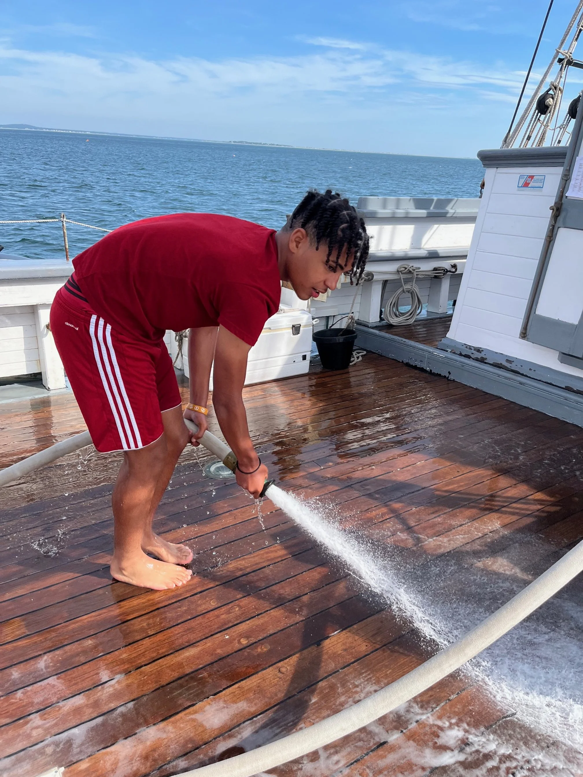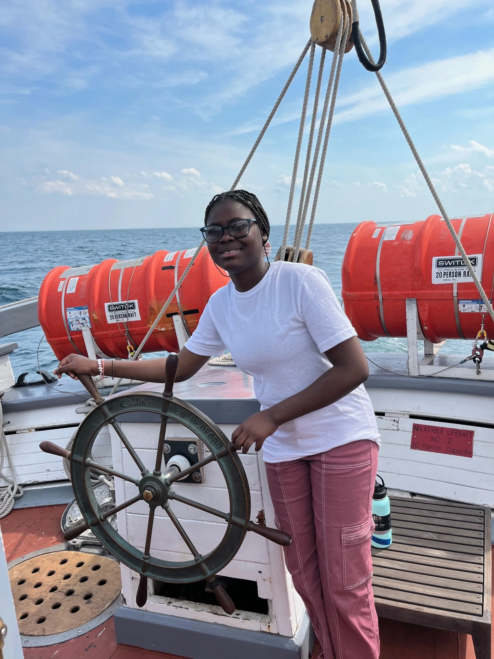 My favorite part of the day was driving the boat at the helm and I saw some dolphins that were in the water close to the boat. The bow watch was hard for me because it was really sunny. My favorite food so far was chicken and fish.I slept well but I woke up to do anchor watch at 4 in the morning. That was hard.