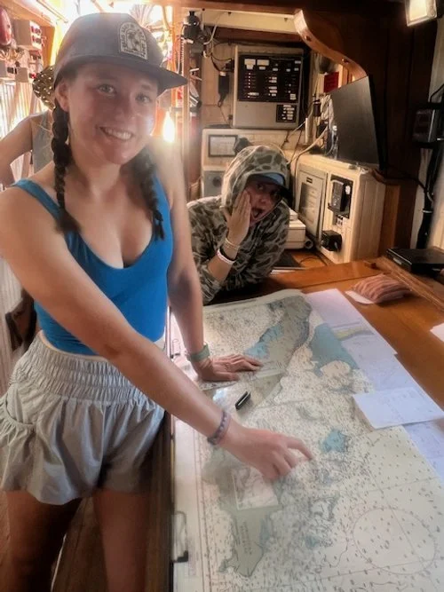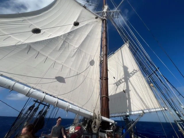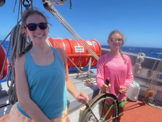 Today is day 7 of the trip but day 6 at sea. Last night we were on watch from 2000-0000 which is one of my favorite watches. We learned how to tie knots and practiced lines while also singing shanties. We watched the sun go down, it was one of the prettiest sunsets so far. And then we went and finished galley cleanup from the previous watch because they ran out of time due to reefing the sail. Midway through we ate our midrat, which was so good. It was passionfruit sorbet. It was pretty calm last night, the waves were only about 3 feet, and it wasn’t quite so windy. My favorite part about this watch and all night watches are looking at all the stars that we don’t get to see back in Charleston. And looking at the bioluminescence, which also are rare back home! And we also saw a few shooting stars.