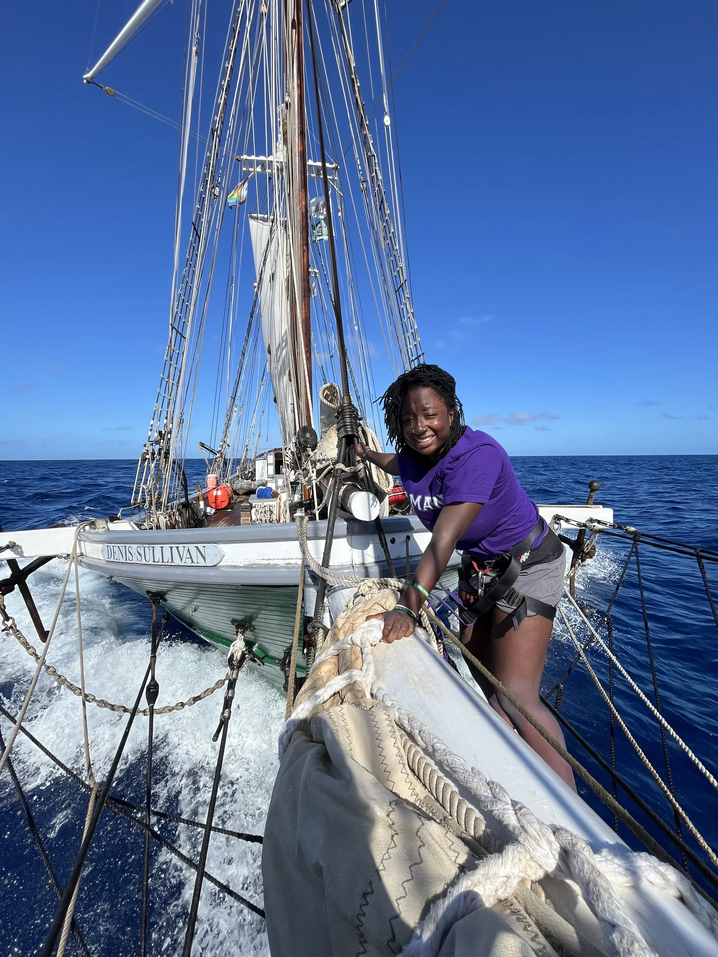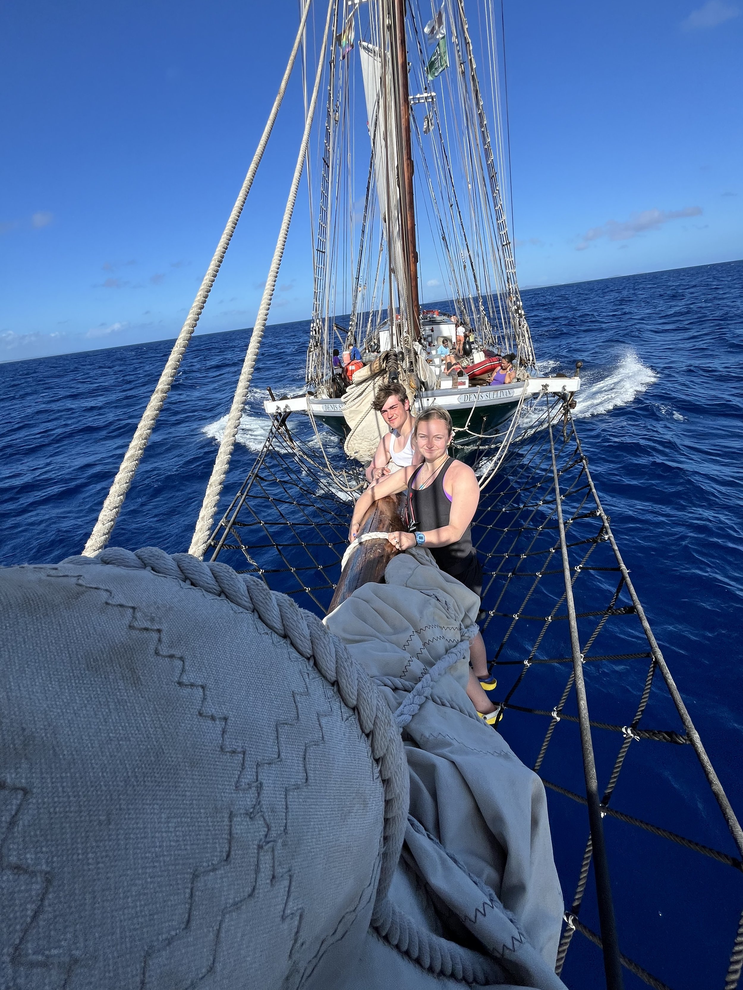 In the day, we went on a sail from Culebra, Puerto Rico to St. Croix. We were only able to put up one sail as we were sailing into the winds. We snacked on gold fish and trail mix in order to keep everyone happy. On the the rotations during the morning sail was the opportunity to sit out on the bowsprit as the boat traversed through the water. The sun seemed brighter and the wind was more refreshing. It is a very compelling view being able to look at the ship from that angle. We had rice and beans for lunch, followed with watermelon slices.