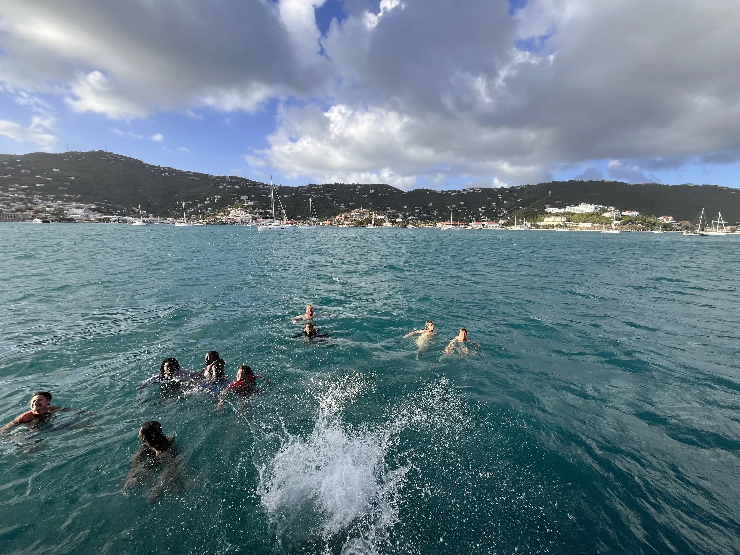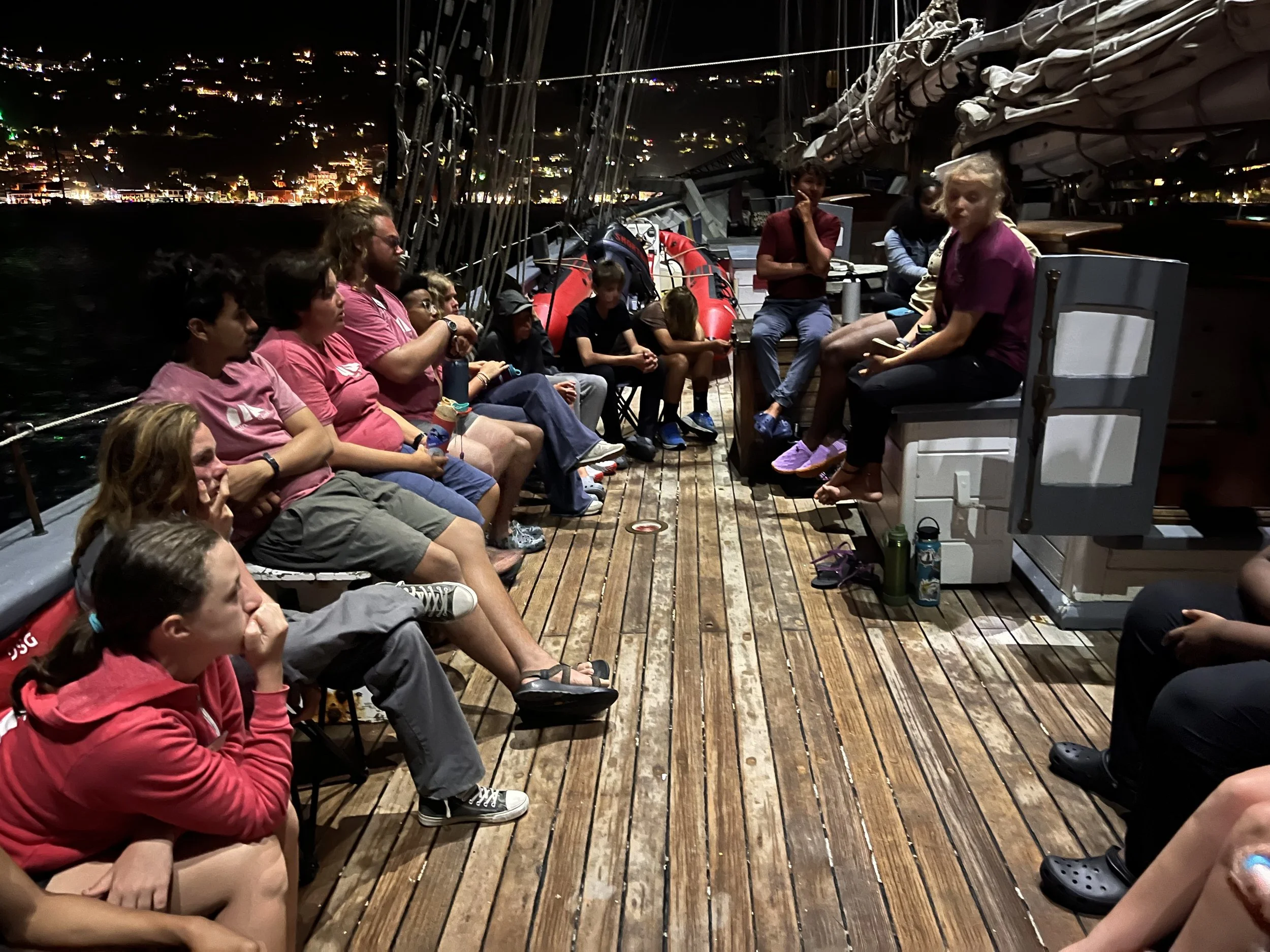 We started off with a rough morning due to the power being out. Took the water taxi to the ship, which was a new experience for many of us, plus it was pretty choppy leading to many of us getting wet. Once we got aboard we went below to make our bunks which was a bit of a challenge because they were so small. Then we played some get to know you games with our watches and classmates. We learned to communicate without sound instead using our hands to point and move each other. We set the main and the staysail. Our watch was on the peak halyard which is one of the lines that picks up the sail. We had lunch, which we set up and cleaned up, doing so many dishes, and then did a swim test and swim time. The waves were kind of big so swimming was fun but challenging. We had nachos and chilly for lunch and jambalaya for dinner. We did safety checks, learned about checking the bilges and that there are fire extinguishers all over the place. We are looking forward to kayaking and more swimming. We are also looking forward to improving our swimming and knots as well as looking forward to going aloft and the bioluminescent bay.