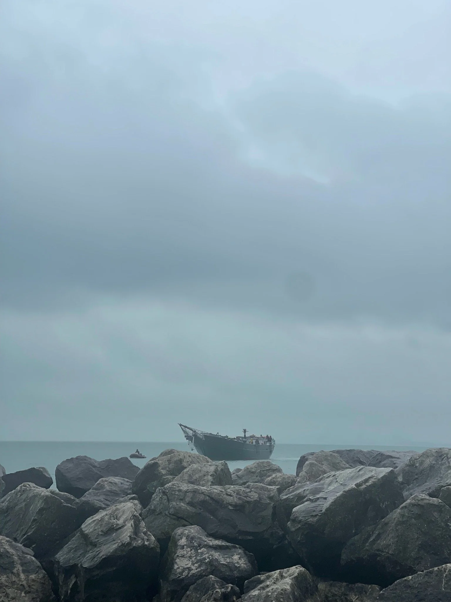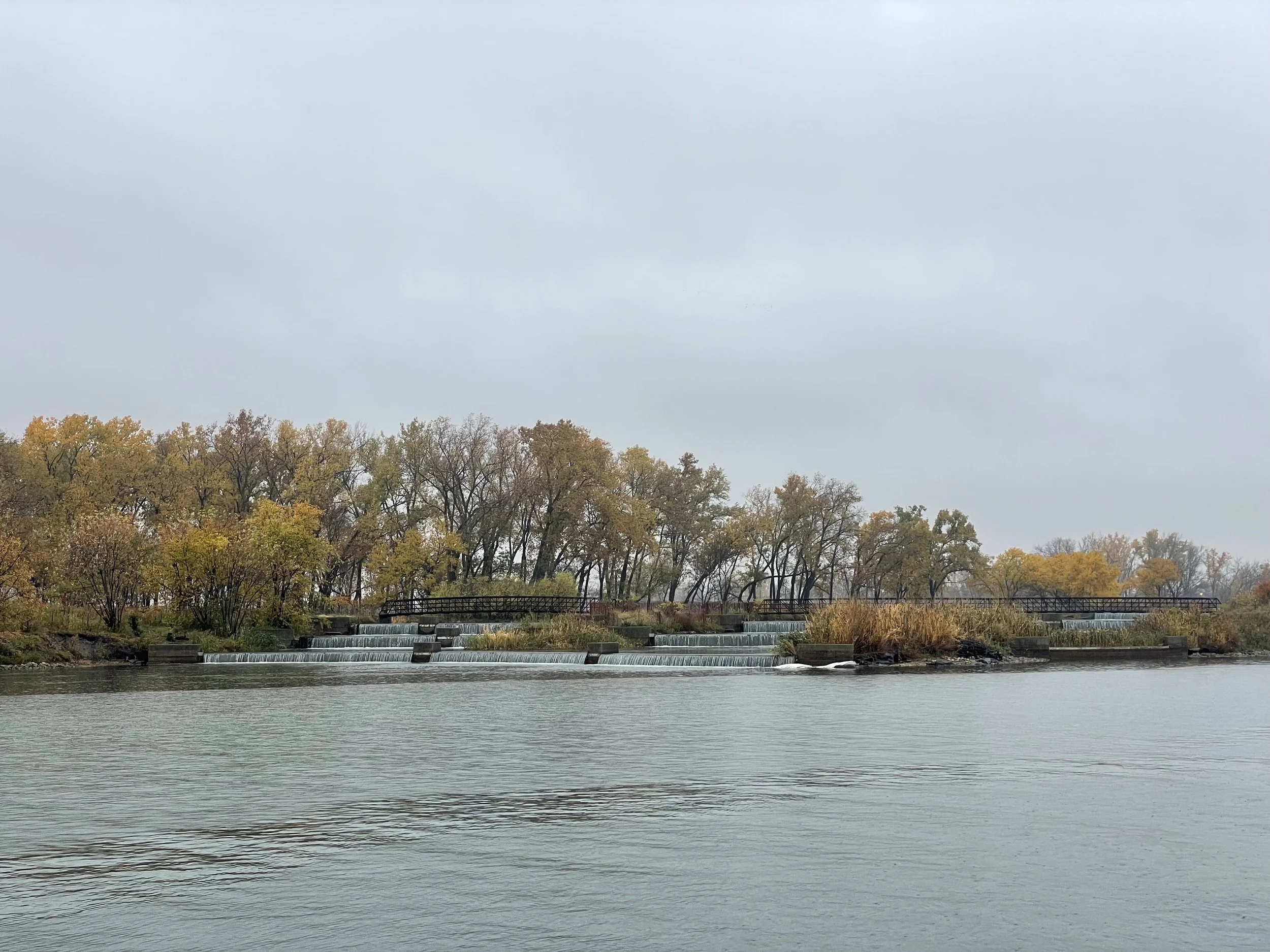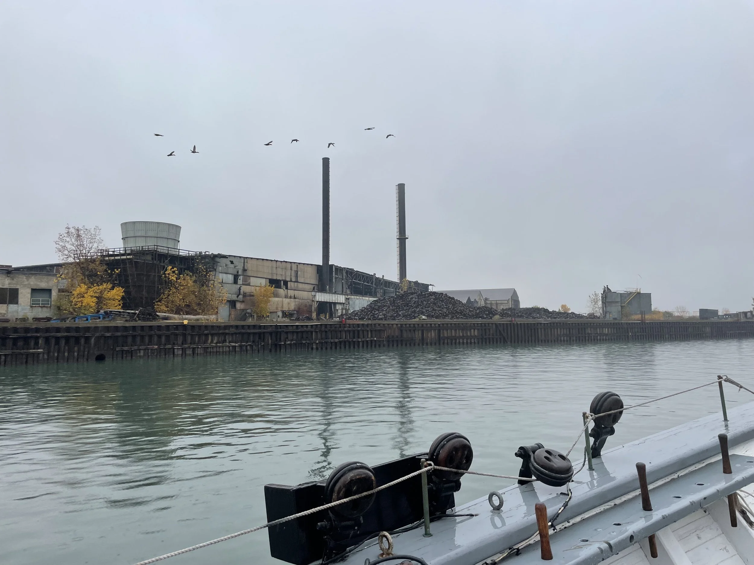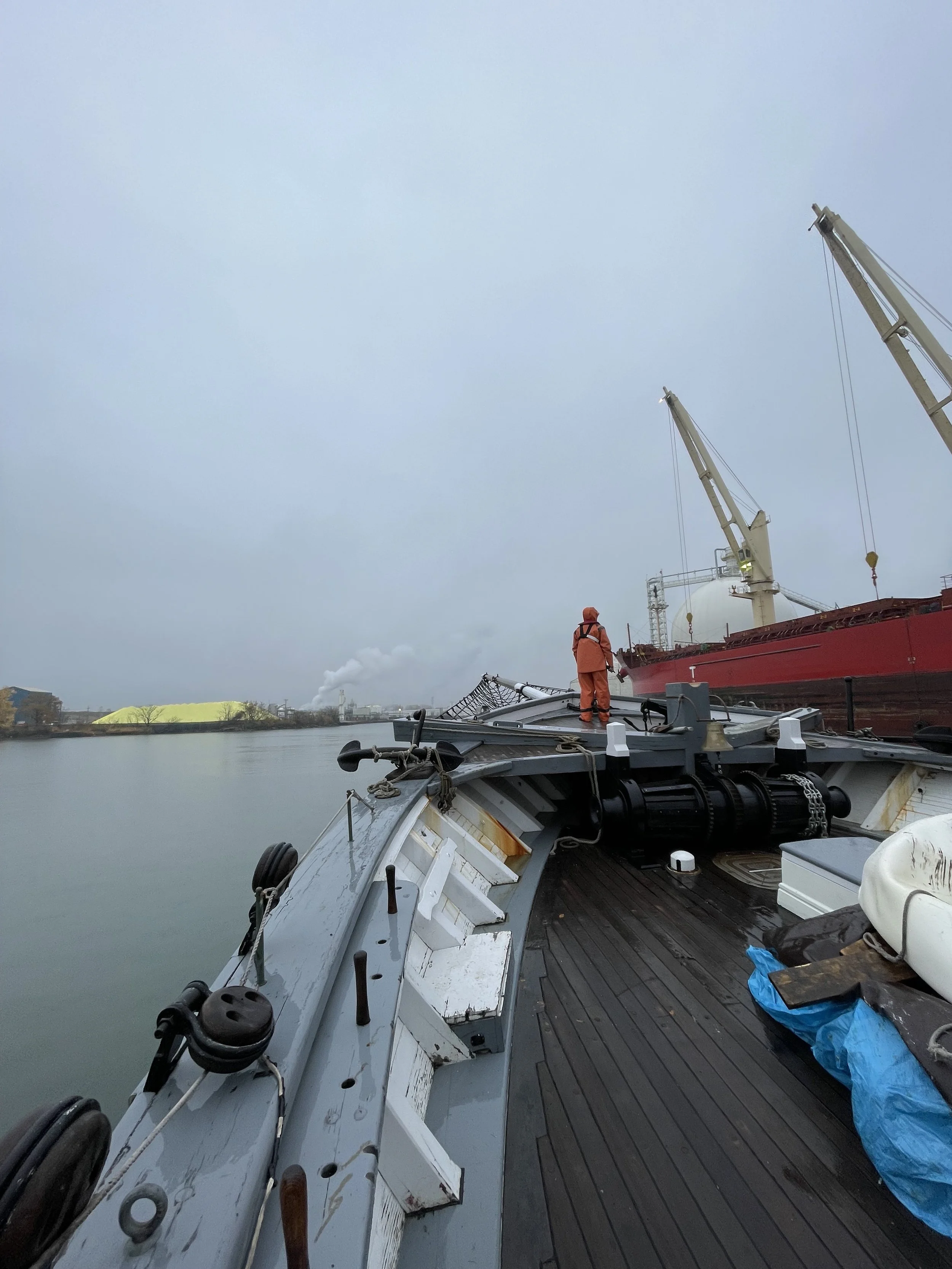 Being on the river feels strange—more like being on a train than a boat. There is so much to look at—trees and factories and garbage dumps and boats five times as high as the Sullivan. There was a scaffolded series of waterfalls that looks like it was constructed for fish to travel upstream. There was a yard piled with sandy mountains a bright yellow color. I have a lot of questions about everything we’re seeing, but we are close to the shore, so it’s hard to keep up.