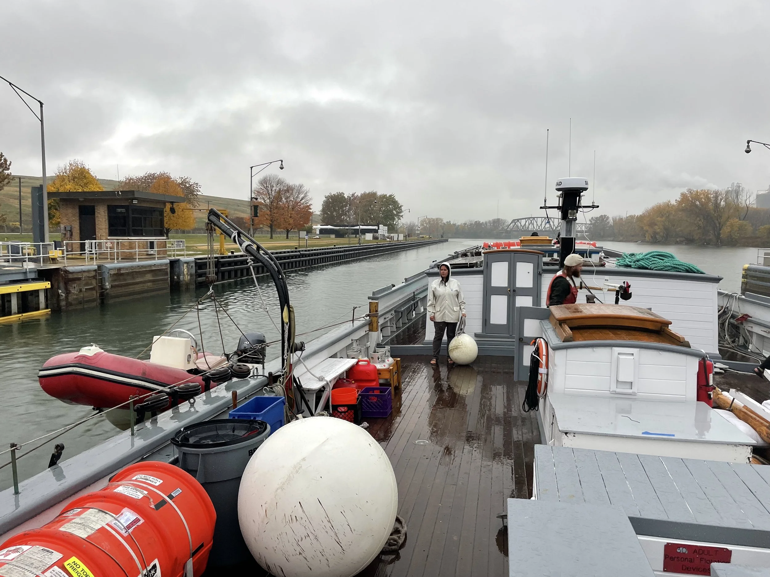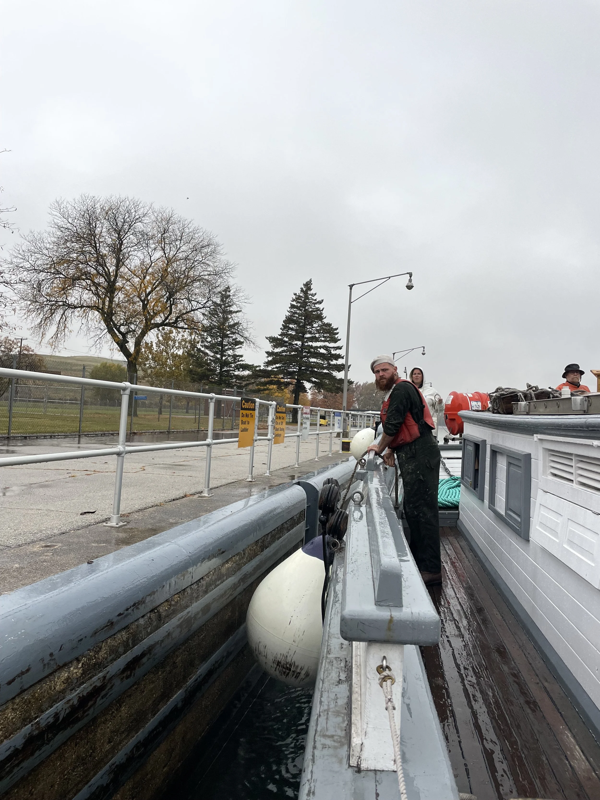 A lock official came by to say hello. He explained that while this lowered us 4 feet over a distance of 1,000 feet, the next few locks on our route will drop us more than 30 feet in a smaller chamber. He asked us a few questions about Denis Sullivan and took a photo for his department to post on their social media channels. “We don’t get a lot of boats like you all through here,” he told us.
