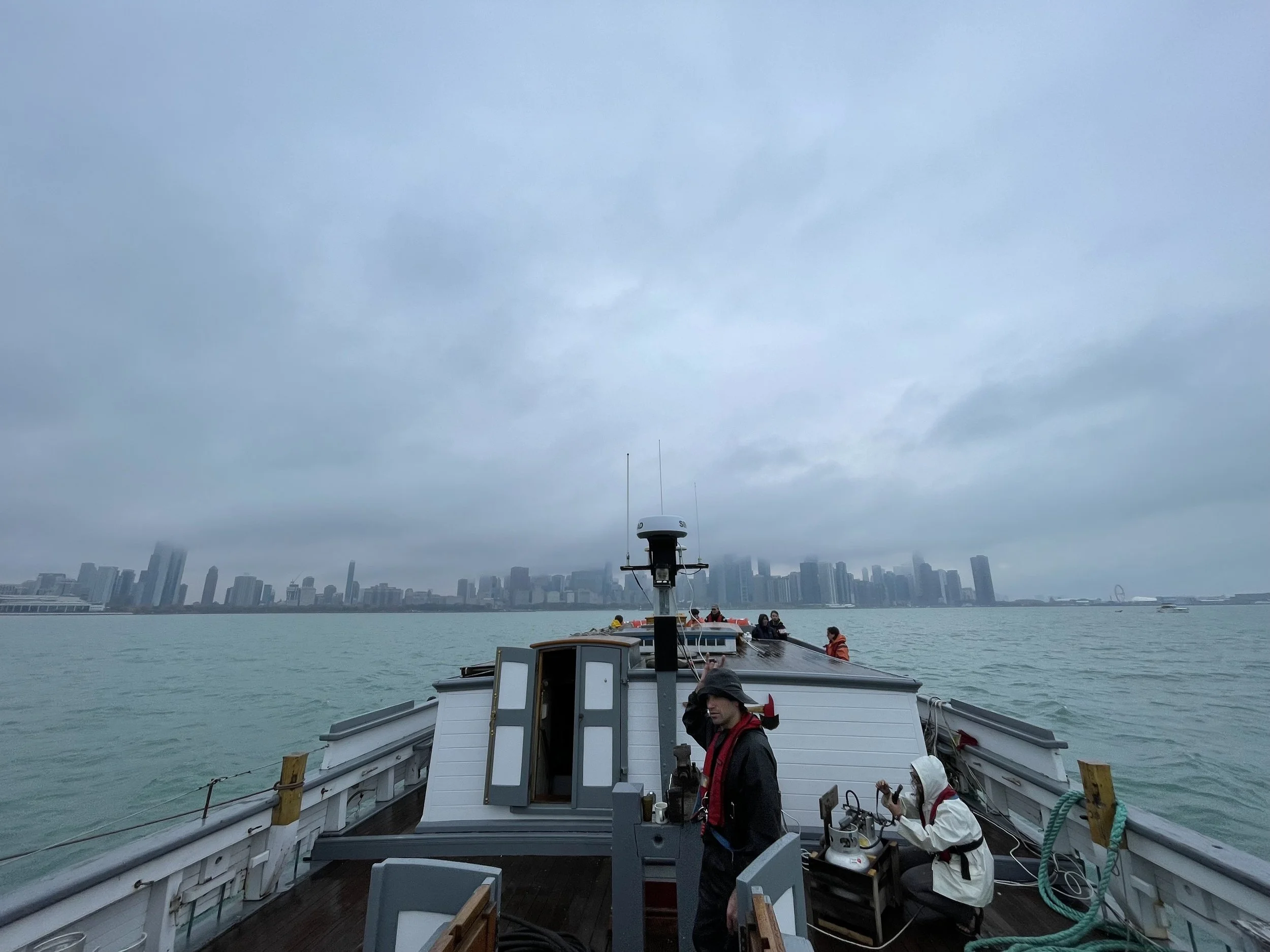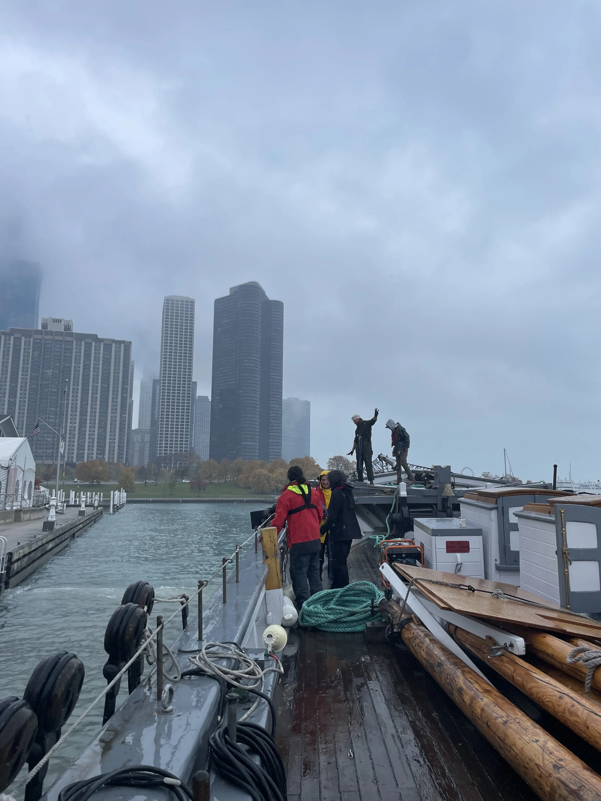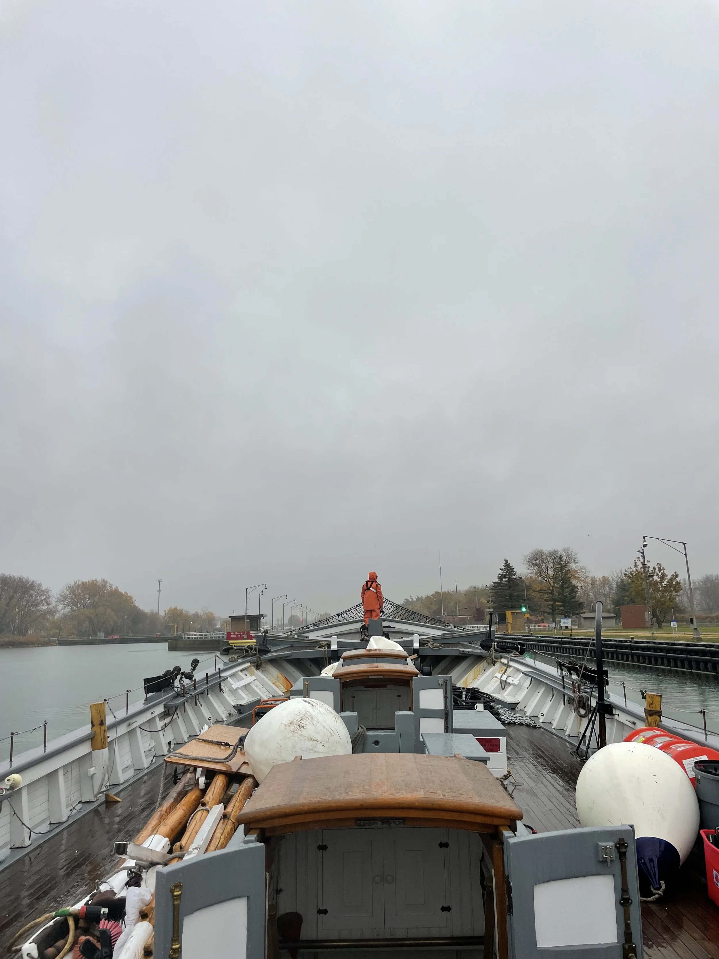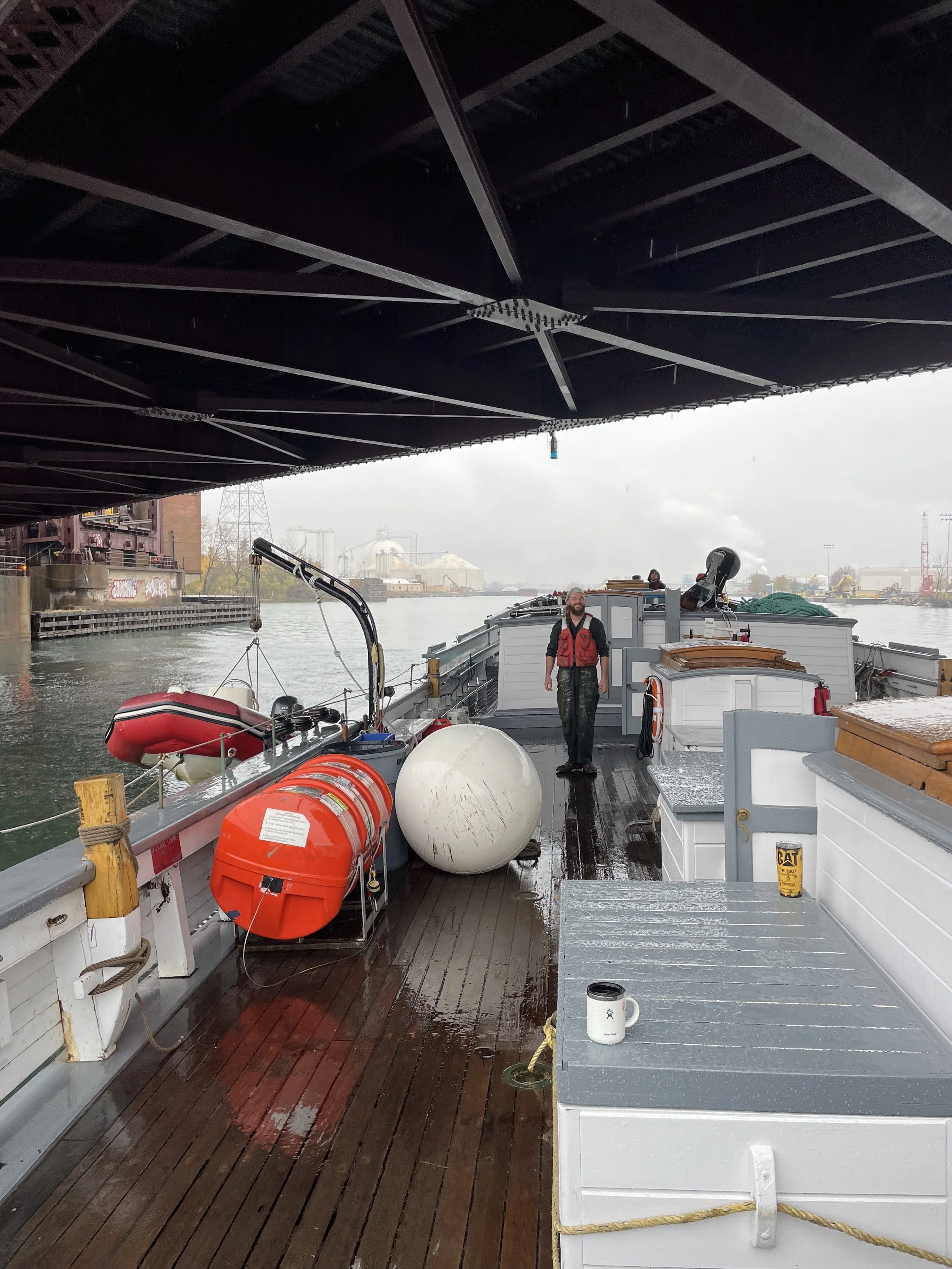 After departing from the fuel dock, we motored back into Illinois and soon entered the Calumet River. Almost immediately, we passed under a bridge so low it looked like the crew member on forward lookout would be able to reach up and touch the steel beams. The second bridge we passed under, not as low as the first, was a drawbridge. I was surprised to see it open ahead of us—until I realized that it was actually opening for a much smaller sailboat coming up behind us. That’s why we pulled the Sullivan’s masts back in Wisconsin—to transform her into a barge that will slide easily under bridges sometimes no more than 18 feet from the water.