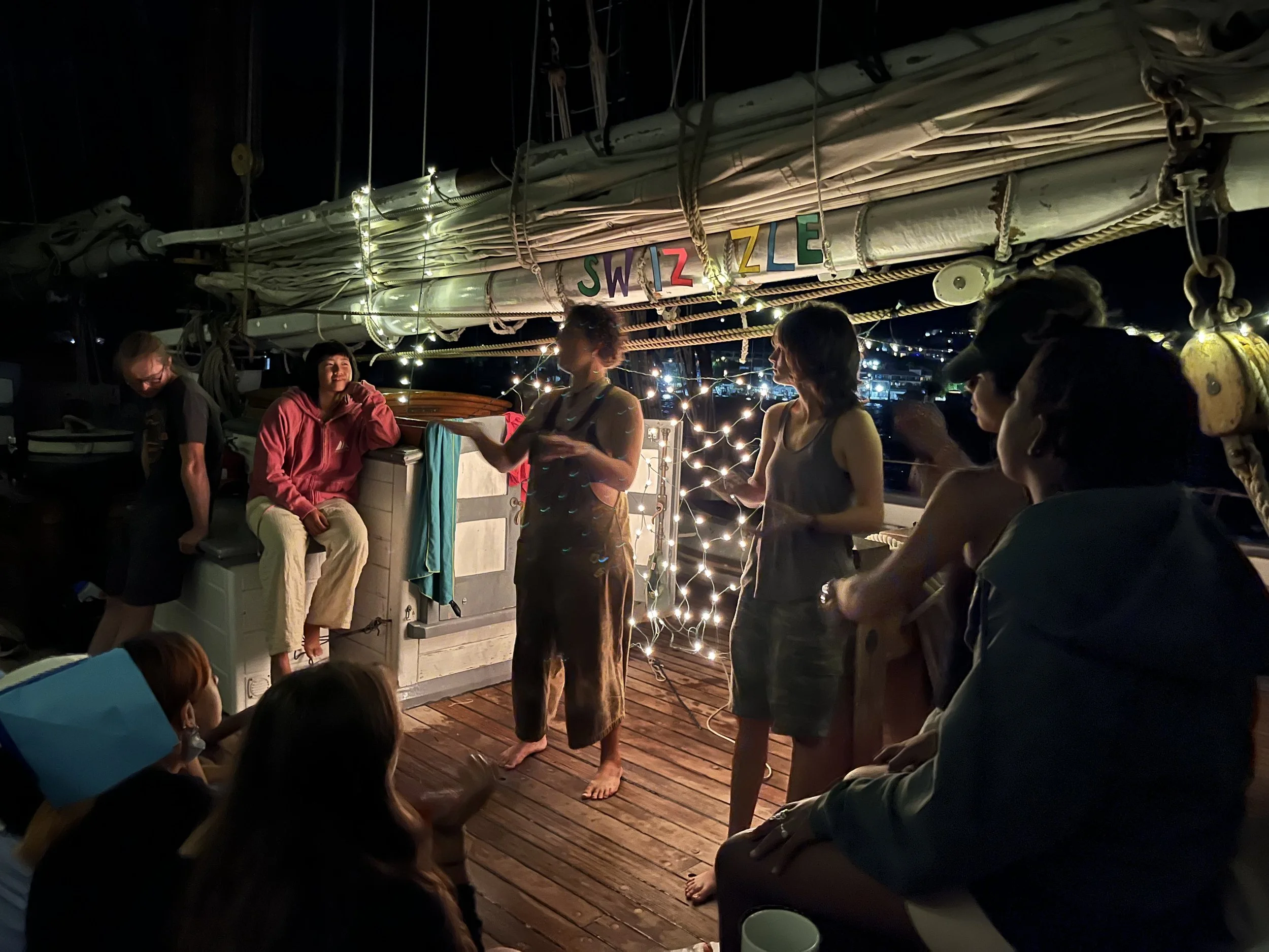 Off-watch, enjoy board games, movie nights, sea shanties, guitar sessions, and stargazing.